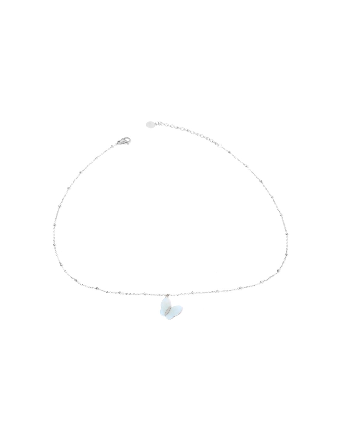 Collar de cadena plateada con un colgante de mariposa de diseño minimalista, con líneas suaves y simples que evocan elegancia y sutileza. La mariposa, sin adornos excesivos, aporta un toque delicado y moderno, perfecto para quienes buscan una pieza discreta pero llena de significado.