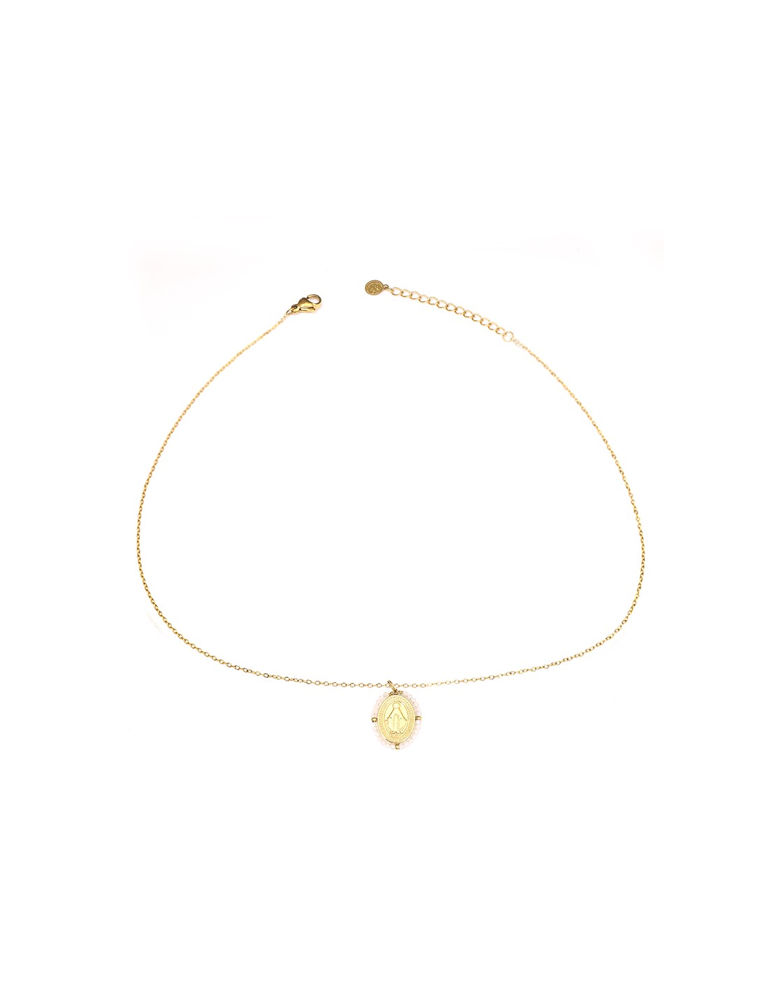 Collar con una fina cadena dorada con un colgante en forma de medalla religiosa, enmarcada por pequeñas cuentas negras que aportan un contraste elegante y distintivo. Ideal para quienes buscan una joya con significado espiritual y un toque sofisticado. Perfecto para uso diario o como regalo con valor simbólico.