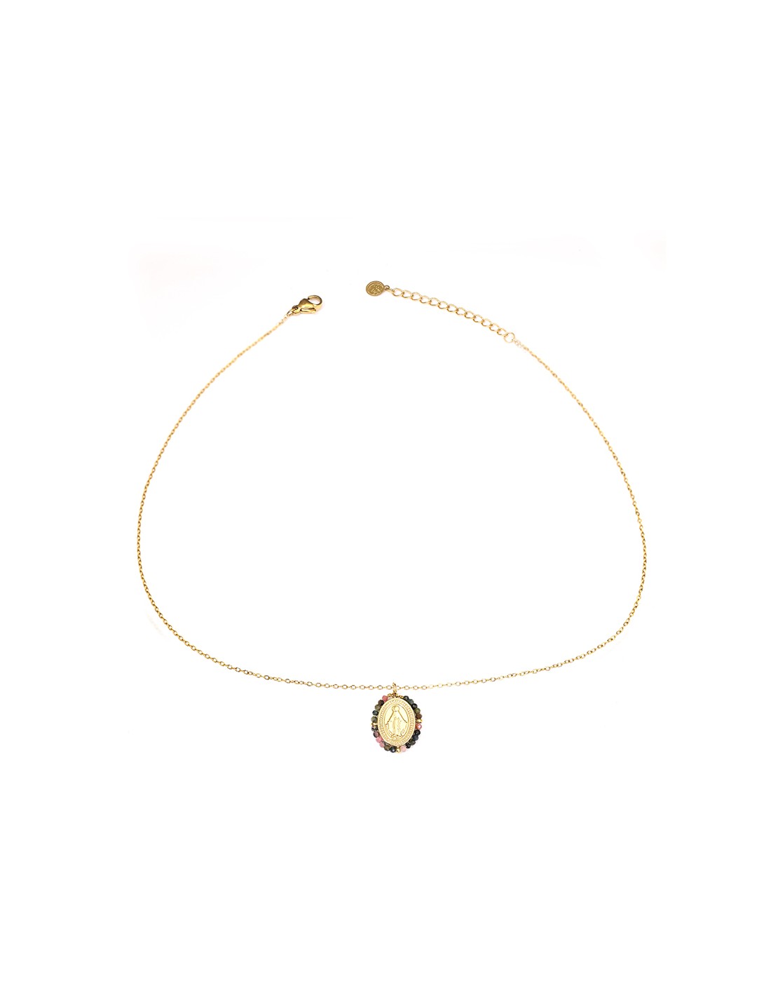 Collar con una fina cadena dorada con un colgante en forma de medalla religiosa, enmarcada por pequeñas cuentas negras que aportan un contraste elegante y distintivo. Ideal para quienes buscan una joya con significado espiritual y un toque sofisticado. Perfecto para uso diario o como regalo con valor simbólico.