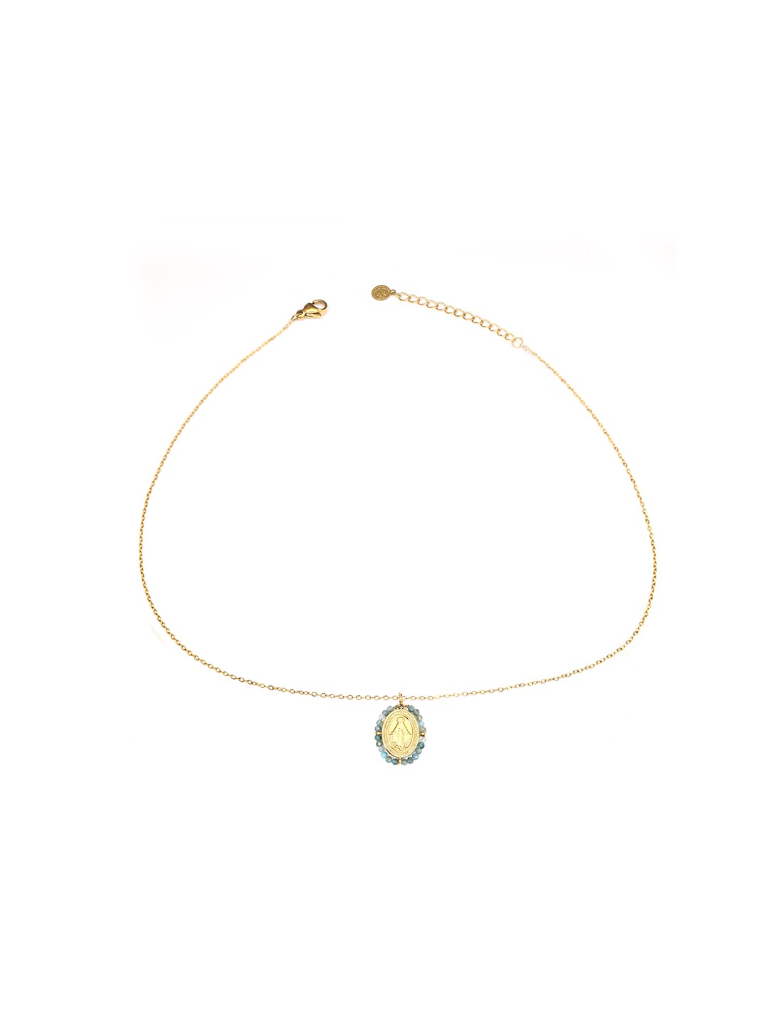 Collar con una fina cadena dorada con un colgante en forma de medalla religiosa, enmarcada por pequeñas cuentas negras que aportan un contraste elegante y distintivo. Ideal para quienes buscan una joya con significado espiritual y un toque sofisticado. Perfecto para uso diario o como regalo con valor simbólico.