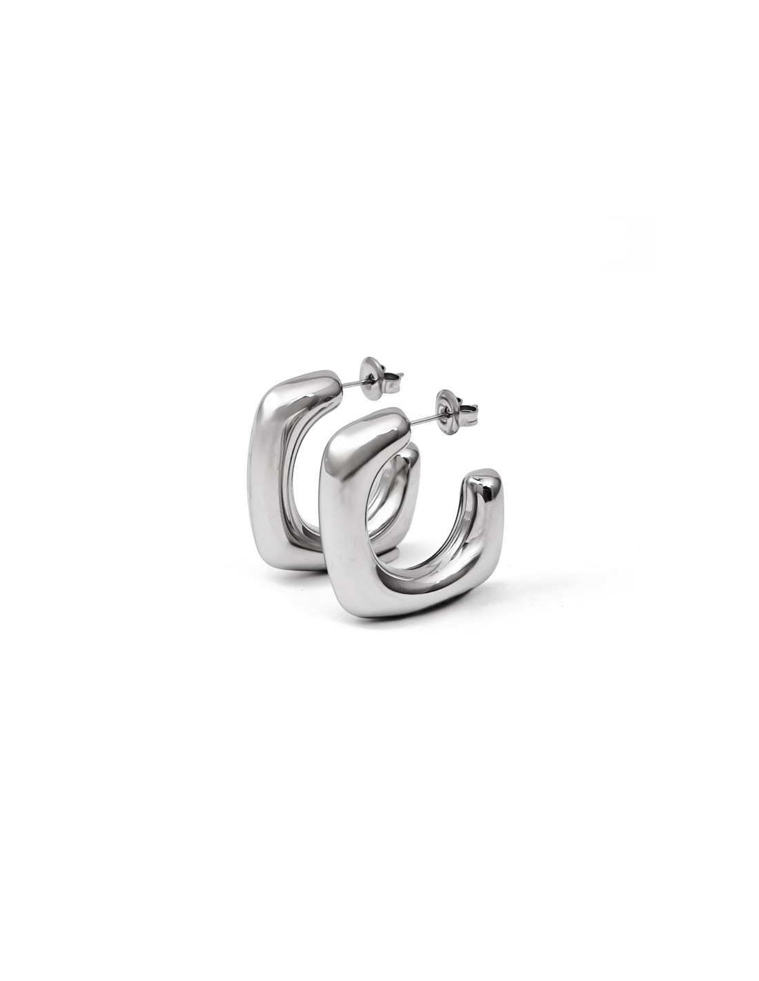 Pendientes de aro plateados con forma cuadrada y bordes redondeados. Un diseño contemporáneo y elegante que combina originalidad y estilo minimalista, ideal para destacar en cualquier ocasión.