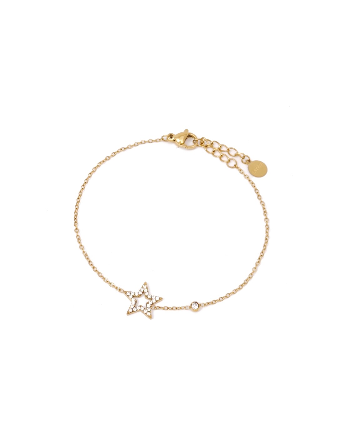 Pulsera dorada con un colgante de estrella calada adornada con circonitas. Un diseño elegante y brillante que aporta un toque mágico y sofisticado, ideal para ocasiones especiales o para iluminar tu estilo diario.