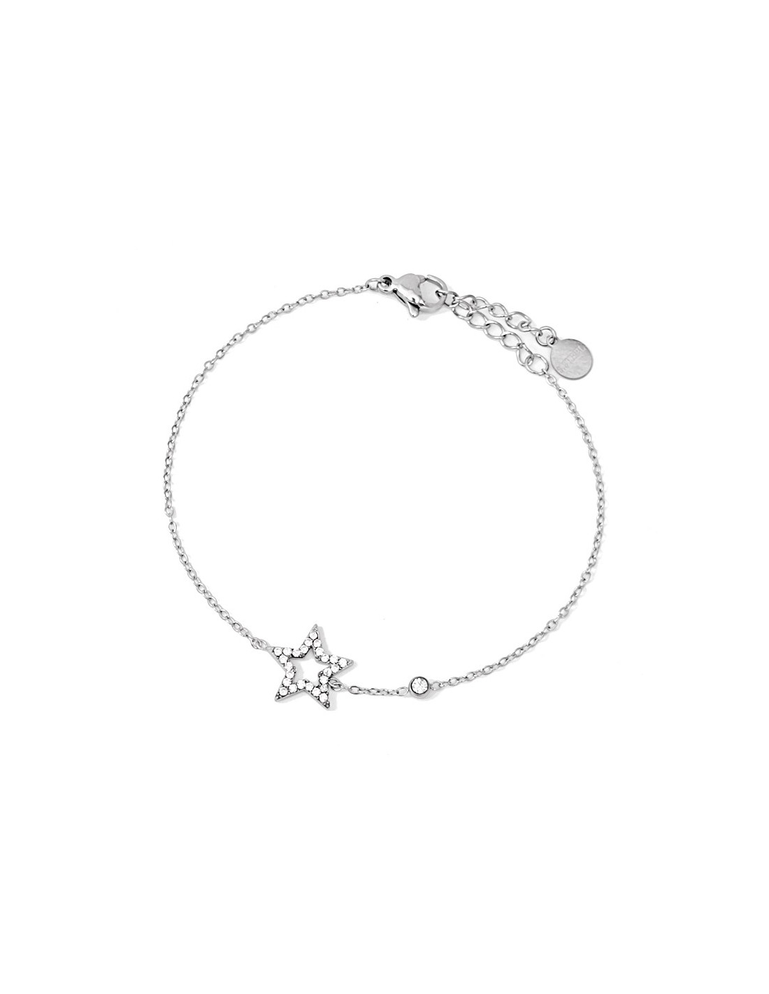 Pulsera plateada con un colgante de estrella calada adornada con circonitas. Un diseño elegante y brillante que aporta un toque mágico y sofisticado, ideal para ocasiones especiales o para iluminar tu estilo diario.
