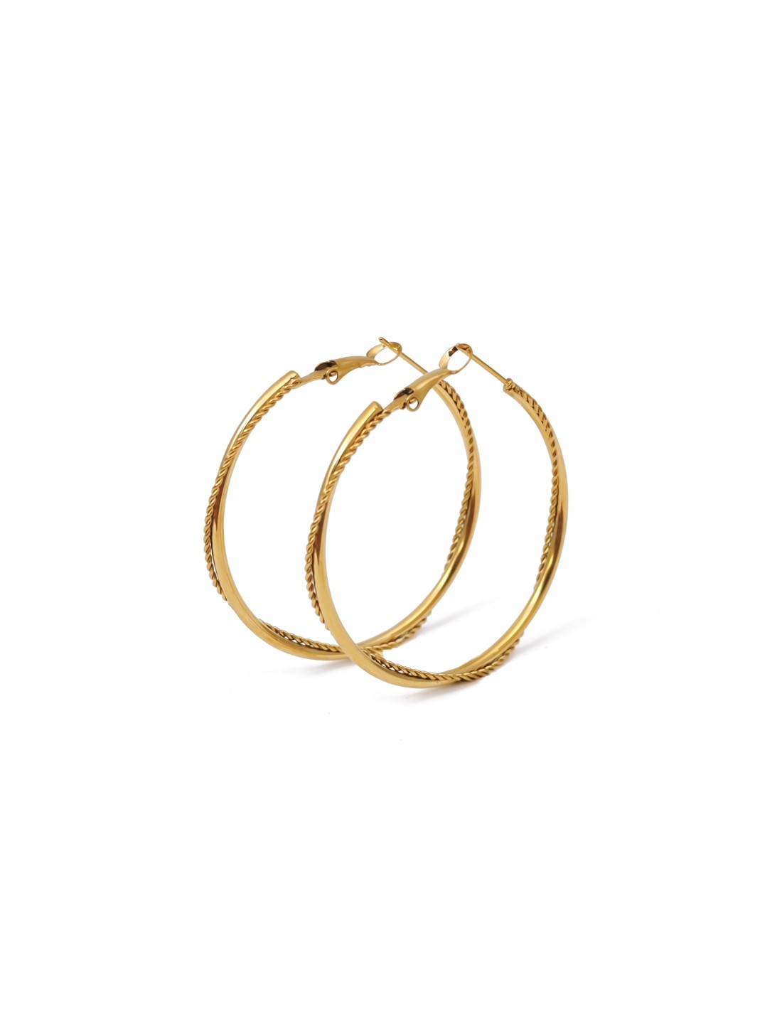 Pendientes de aro dorados con acabado brillante y delicado detalle de cuerda en el borde. Un diseño clásico con un toque distintivo, ideal para combinar con looks casuales o elegantes.