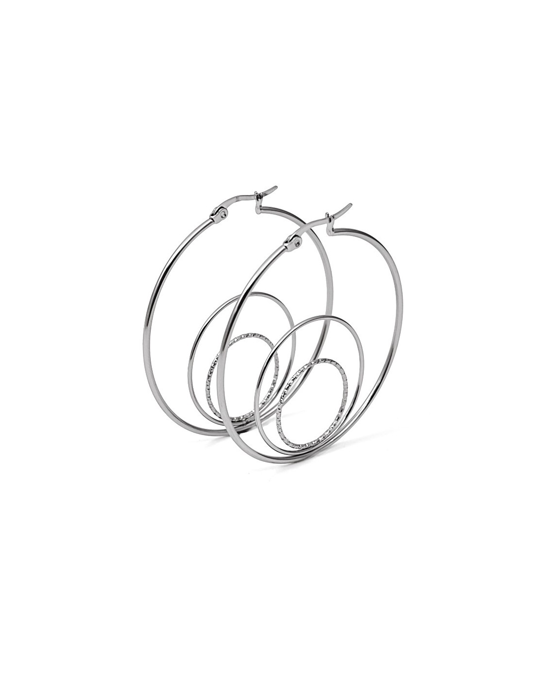 Pendientes plateados con estructura de varios aros concéntricos. Un diseño geométrico y original que aporta movimiento, modernidad y un estilo llamativo a cualquier look.