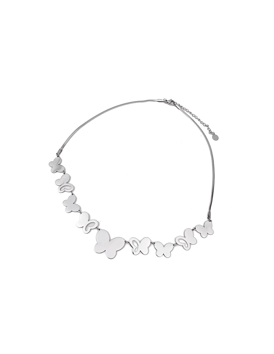 Collar plateado decorado con varias mariposas de diferentes tamaños. Un diseño elegante y delicado que transmite ligereza y feminidad, perfecto para añadir un toque romántico a cualquier look.