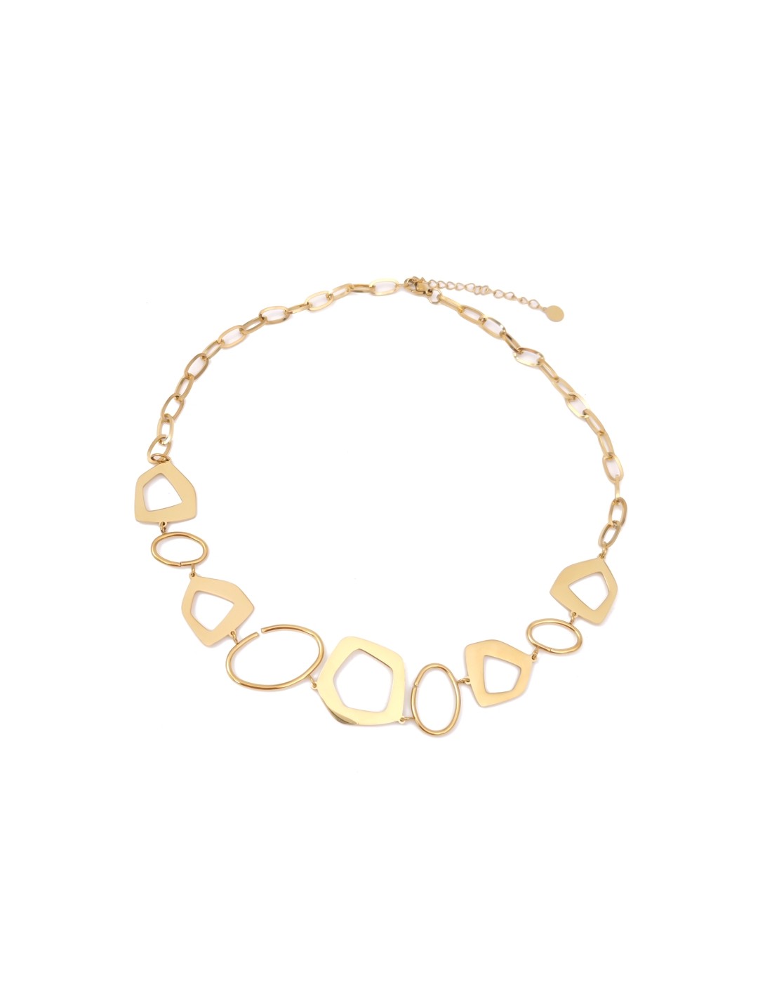 Collar dorado formado por figuras geométricas irregulares y óvalos entrelazados. Un diseño moderno y artístico que transmite originalidad y estilo contemporáneo, ideal para looks sofisticados y creativos.