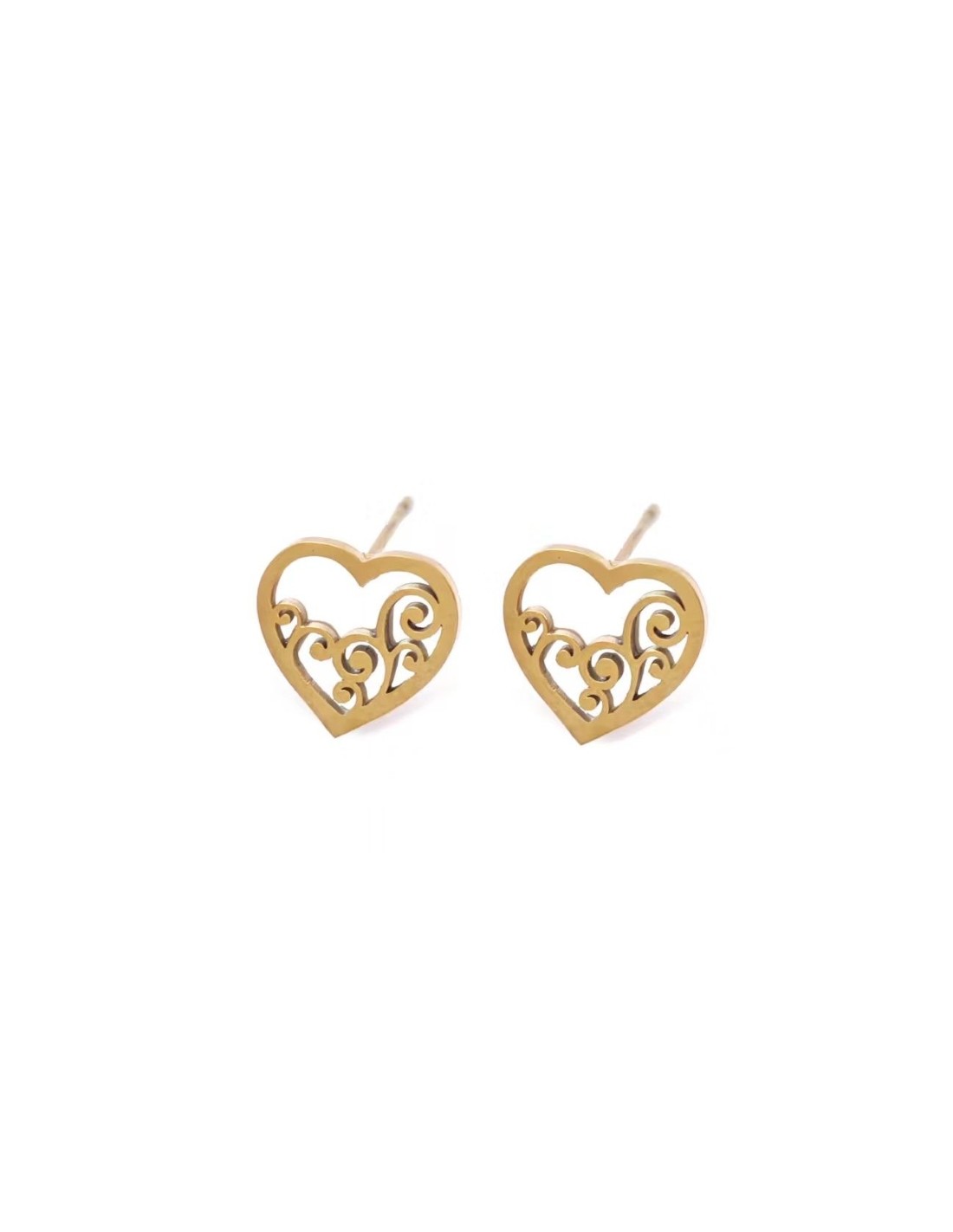 Pendientes dorados en forma de corazón con diseño calado de arabescos, elaborados con nácar. Un estilo romántico y delicado, ideal para expresar amor y feminidad en cualquier ocasión.