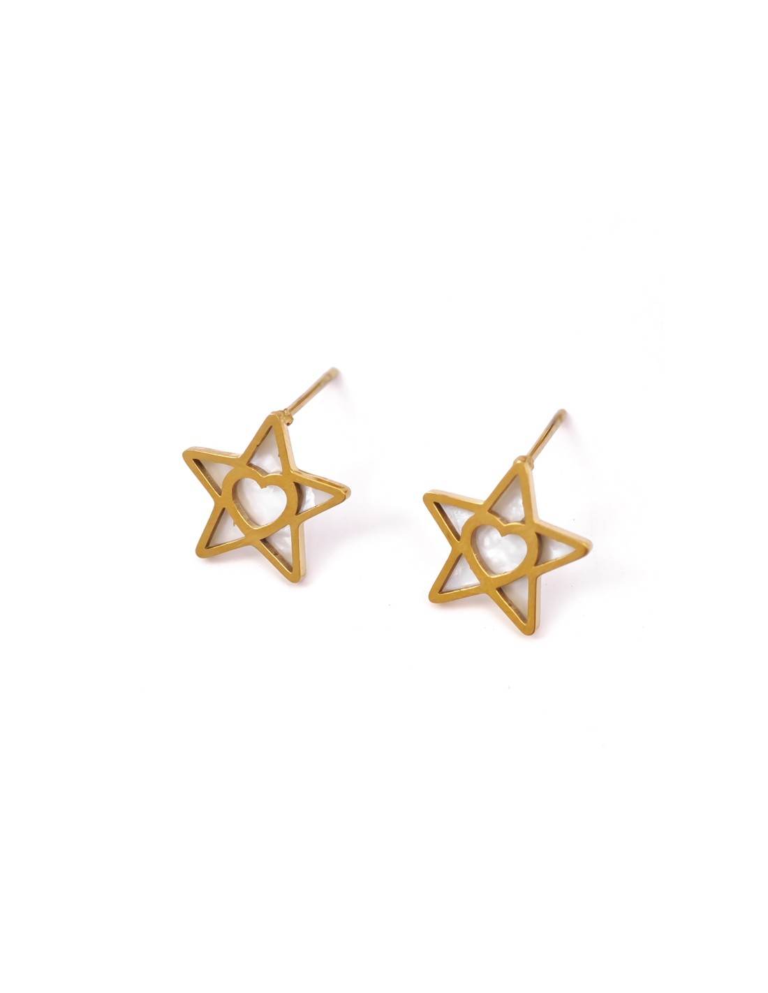 Pendientes dorados en forma de estrella con un delicado corazón en el centro. El brillo natural del nácar aporta elegancia y un toque romántico, ideales para combinar con cualquier look.