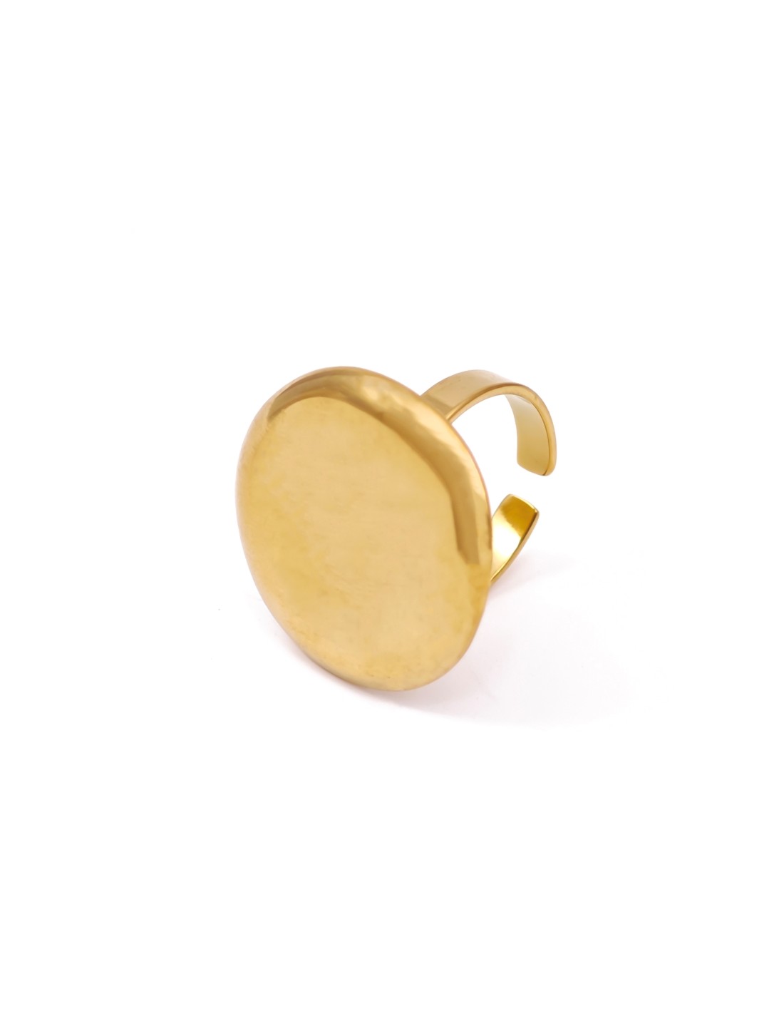 Anillo abierto dorado, con un diseño de gran disco pulido que aporta un estilo moderno y elegante. Ideal para quienes buscan un accesorio llamativo pero minimalista.