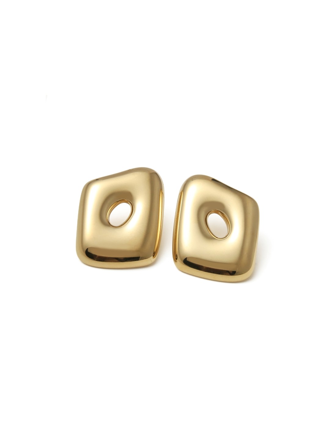 Pendientes destacan por su diseño geométrico irregular con un detalle calado en el centro que aporta volumen y originalidad. El acabado les da un toque elegante y versátil, perfectos para combinar tanto con looks diarios como en ocasiones especiales.