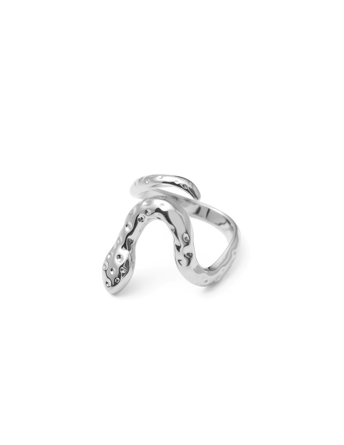 Anillo plateado está inspirado en la forma de una serpiente, con líneas curvas que transmiten movimiento y fuerza. Los detalles texturizados evocan escamas brillantes, aportando un aire misterioso y elegante.