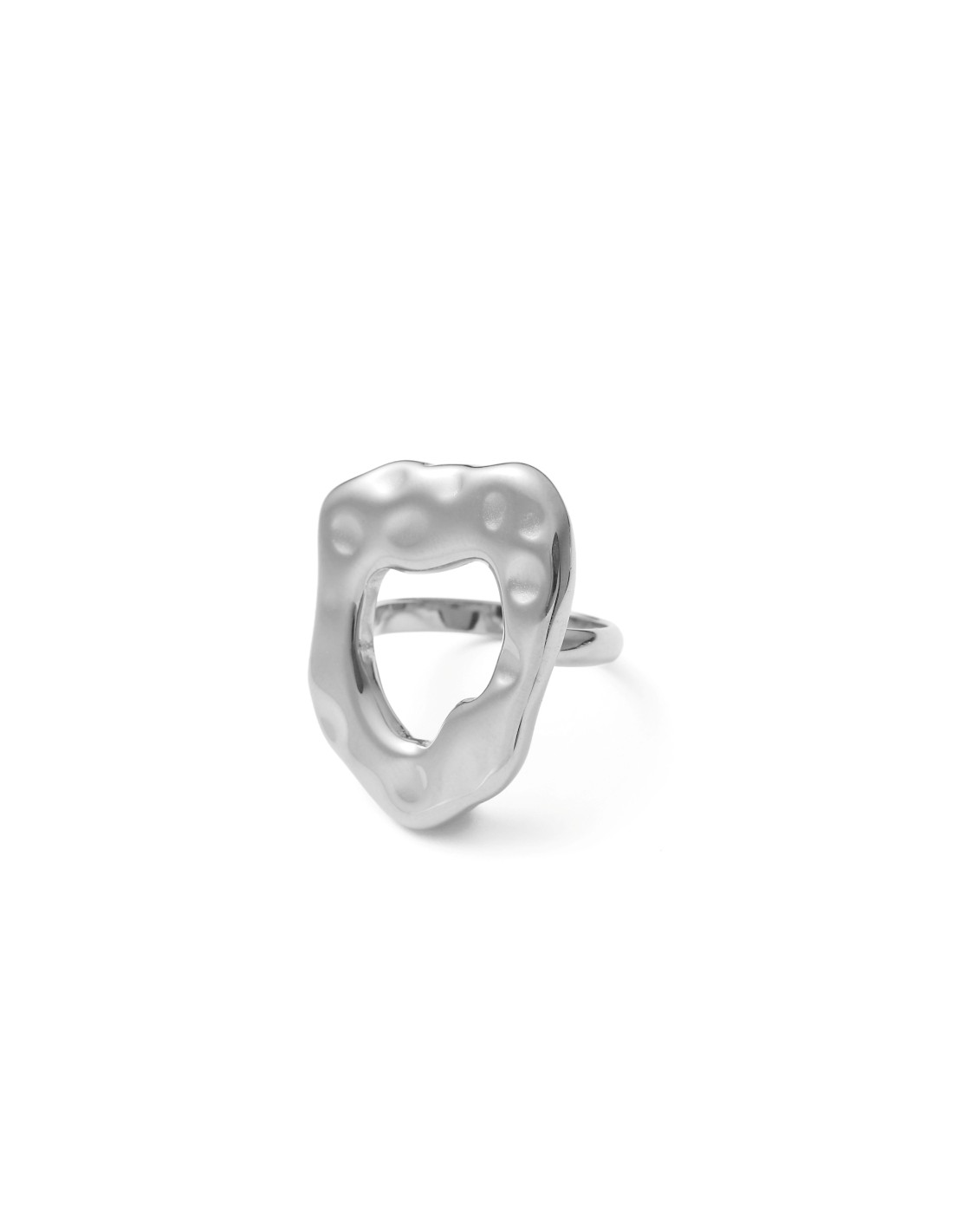 Anillo plateado destaca por su forma irregular y su diseño calado con textura en relieve. Minimalista pero con carácter artístico, es perfecto tanto para el uso diario como para ocasiones especiales, aportando un estilo único y sofisticado.