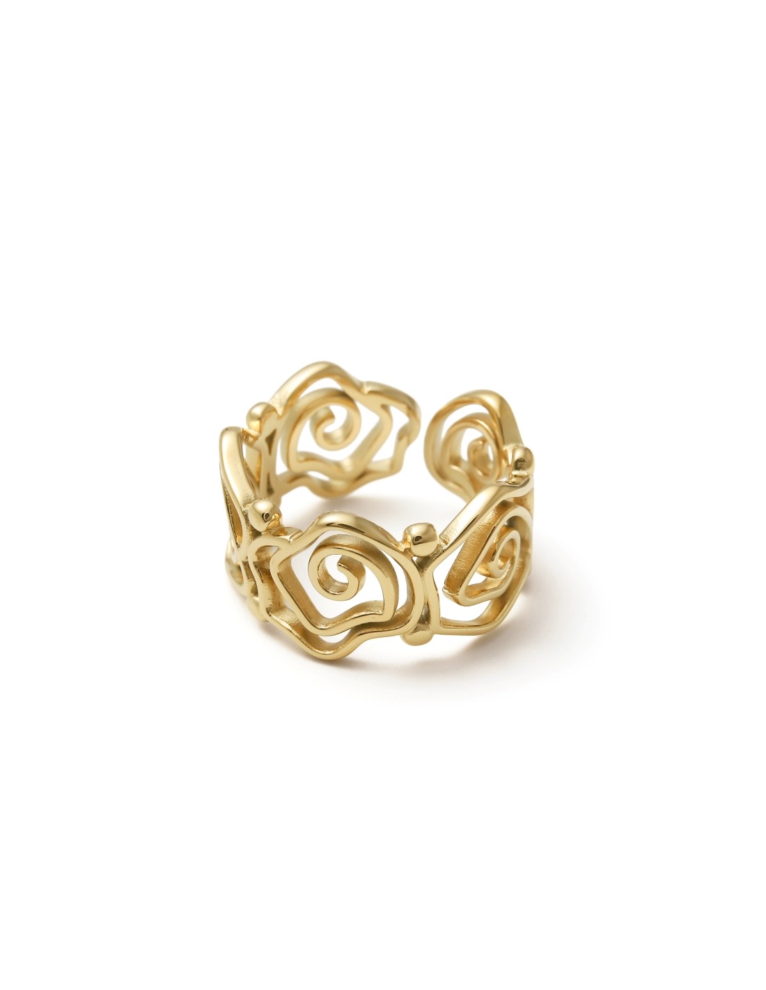 Anillo destaca por su diseño calado con patrones de espirales entrelazadas. El acabado dorado aporta un estilo moderno y minimalista, ideal para llevar solo como pieza protagonista o combinado en looks de capas. Un accesorio que fusiona arte y elegancia.