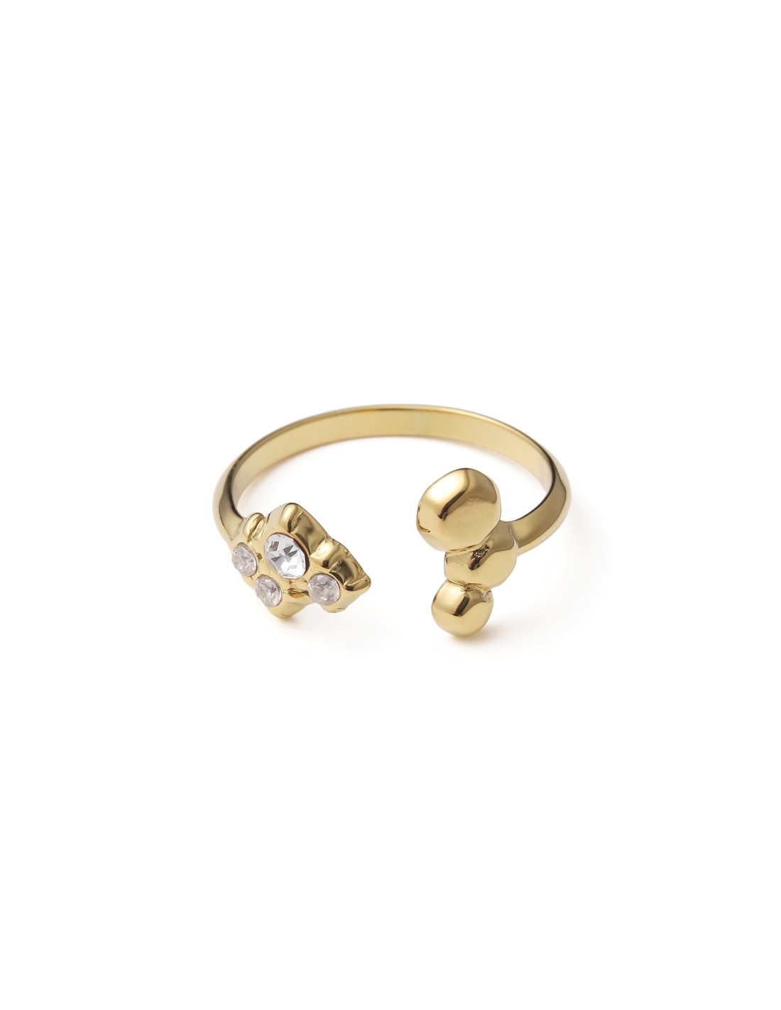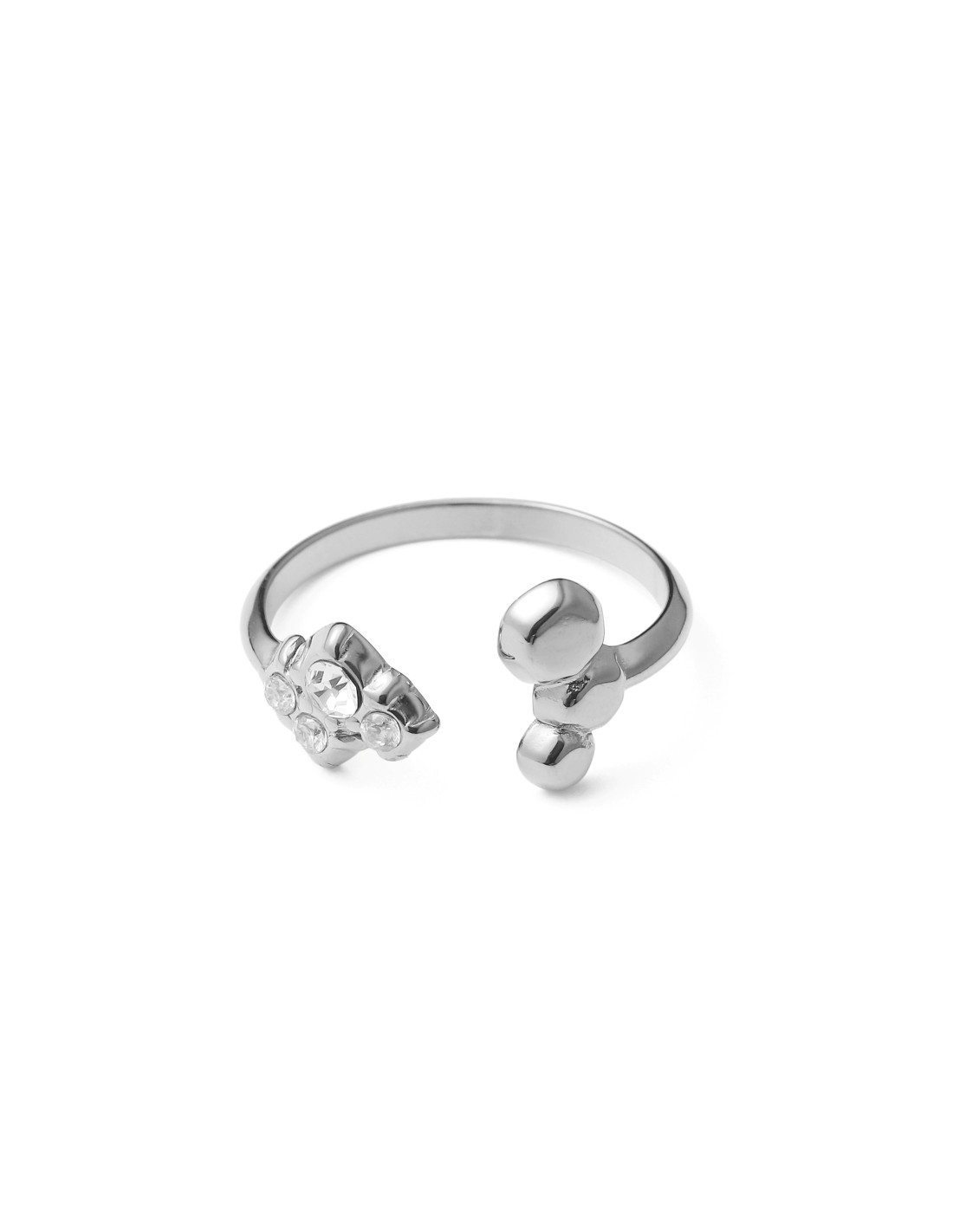 Anillo combina el brillo de las circonitas con la pureza de los puntos metálicos irregulares, evocando la frescura de las gotas de agua y la serenidad de las piedras junto al mar. Un diseño minimalista pero con carácter, ideal para el uso diario y looks modernos.