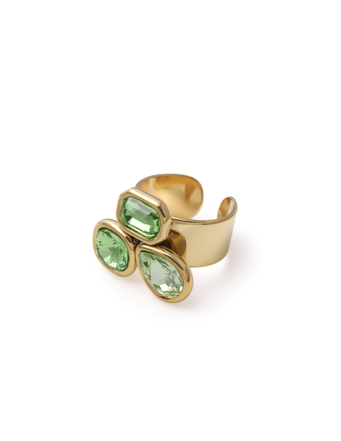 Anillo de aro ancho destaca por tres cristales tallados en forma ovalada y de lágrima, que capturan la luz con cada movimiento. Una pieza llamativa y elegante, perfecta para ocasiones especiales o para añadir un toque de glamour a tu look diario.