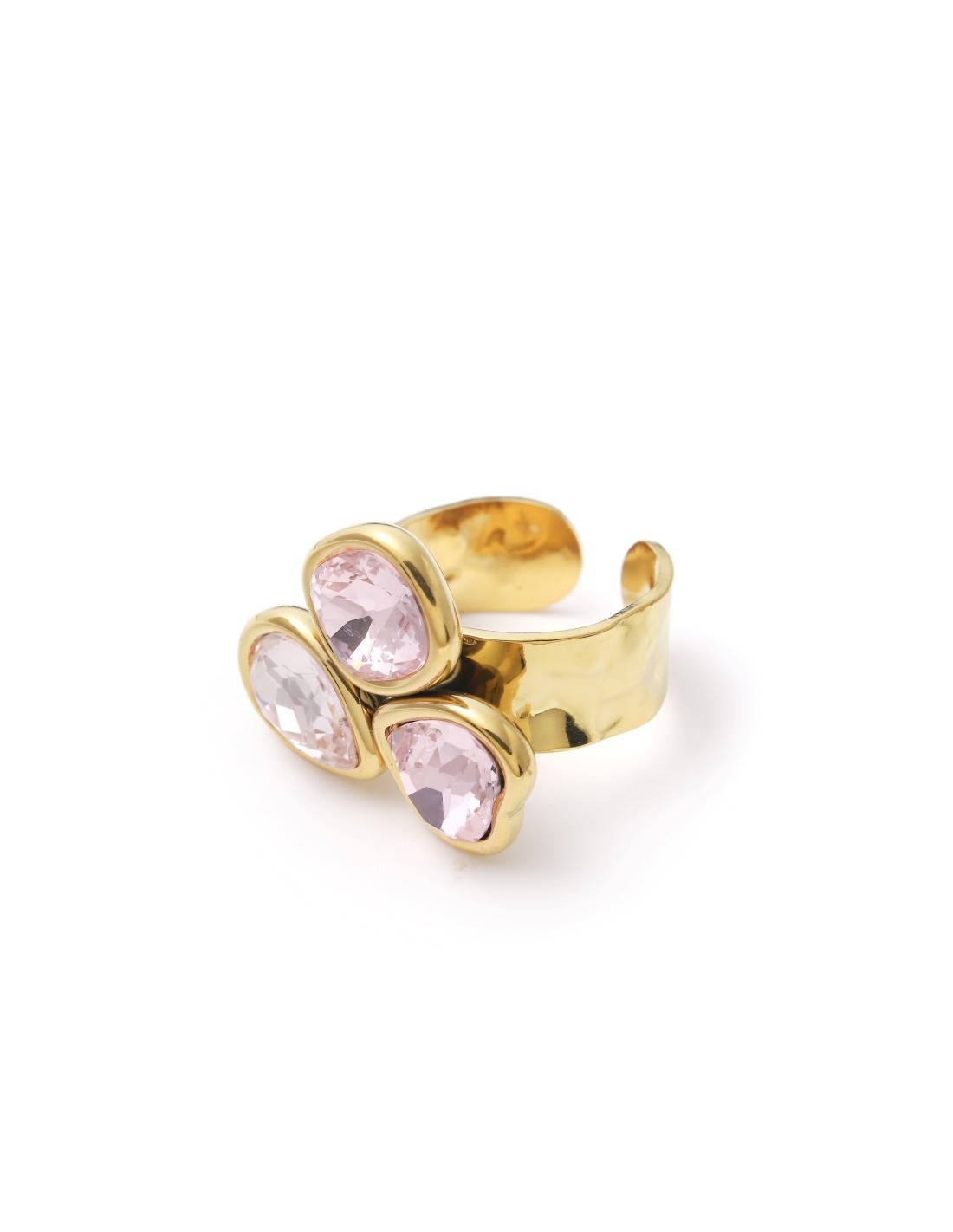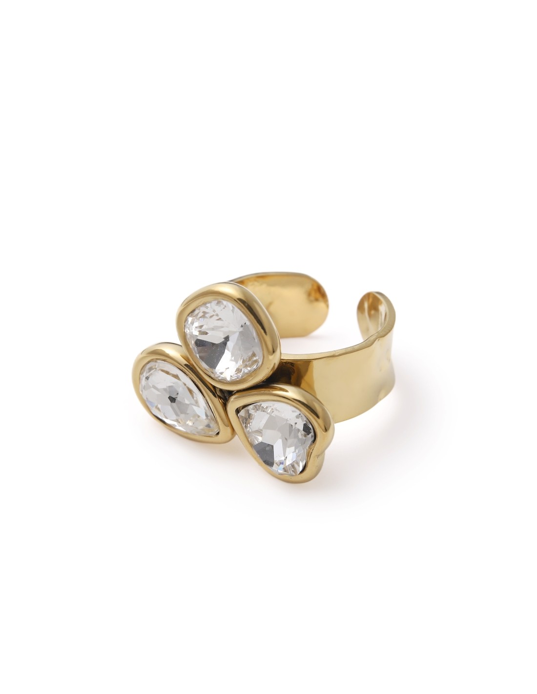 Anillo de aro ancho destaca por tres cristales tallados en forma ovalada y de lágrima, que capturan la luz con cada movimiento. Una pieza llamativa y elegante, perfecta para ocasiones especiales o para añadir un toque de glamour a tu look diario.