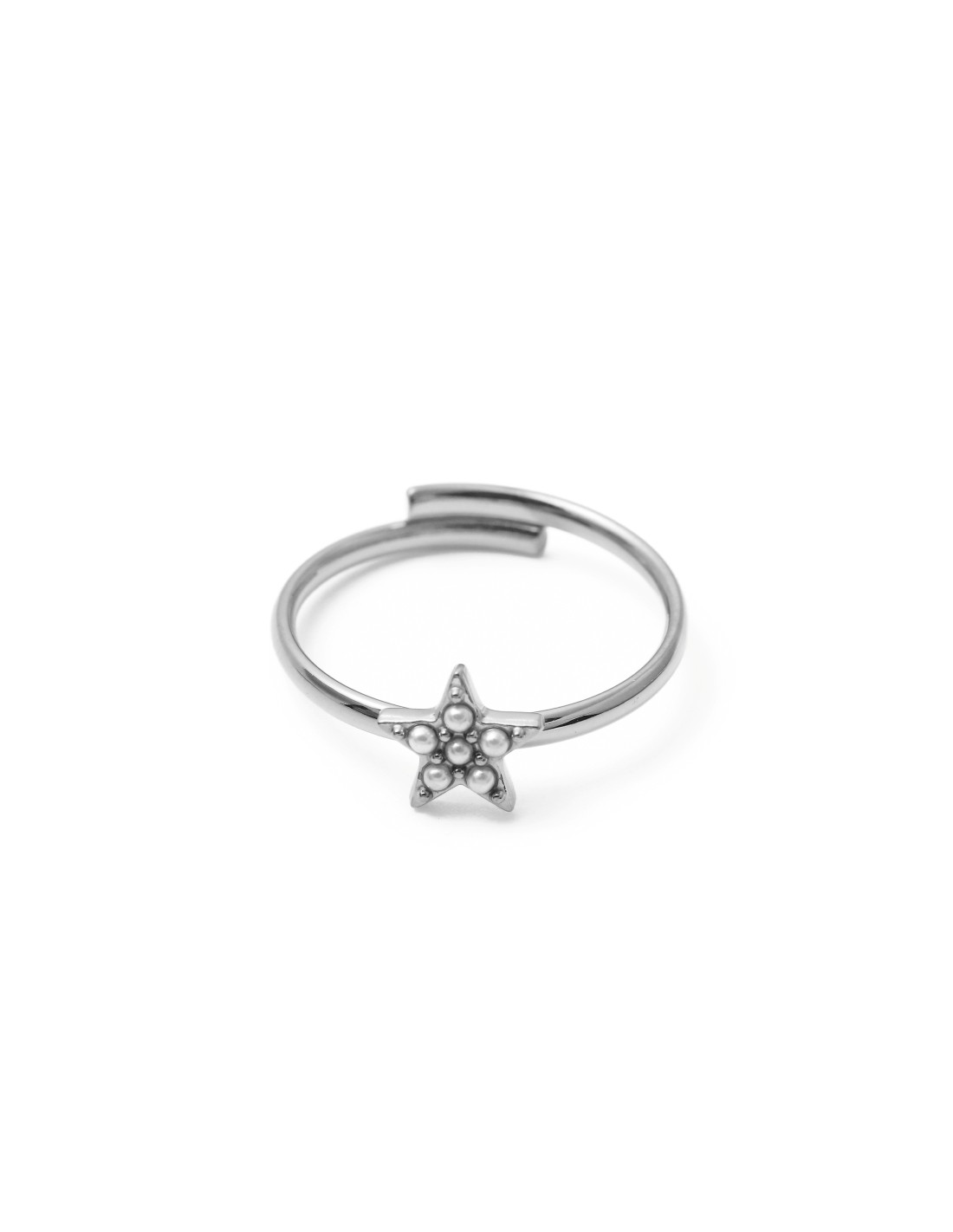 Anillo diseñado en forma de estrella, decorado con delicadas perlas que brillan con sutileza. Una joya minimalista y a la vez soñadora, símbolo de esperanza y protección. Perfecta para llevar sola o combinada con otros anillos, aportando un toque de encanto romántico.