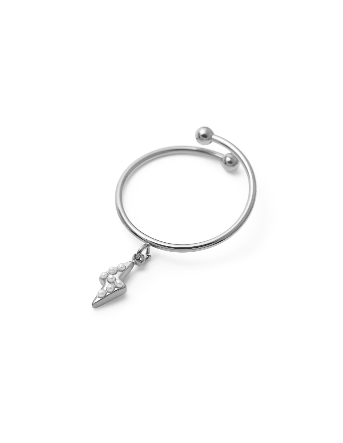 Anillo abierto con un colgante en forma de rayo, decorado con pequeñas perlas blancas. Una pieza moderna y llamativa que combina fuerza y delicadeza, perfecta para expresar estilo y personalidad.
