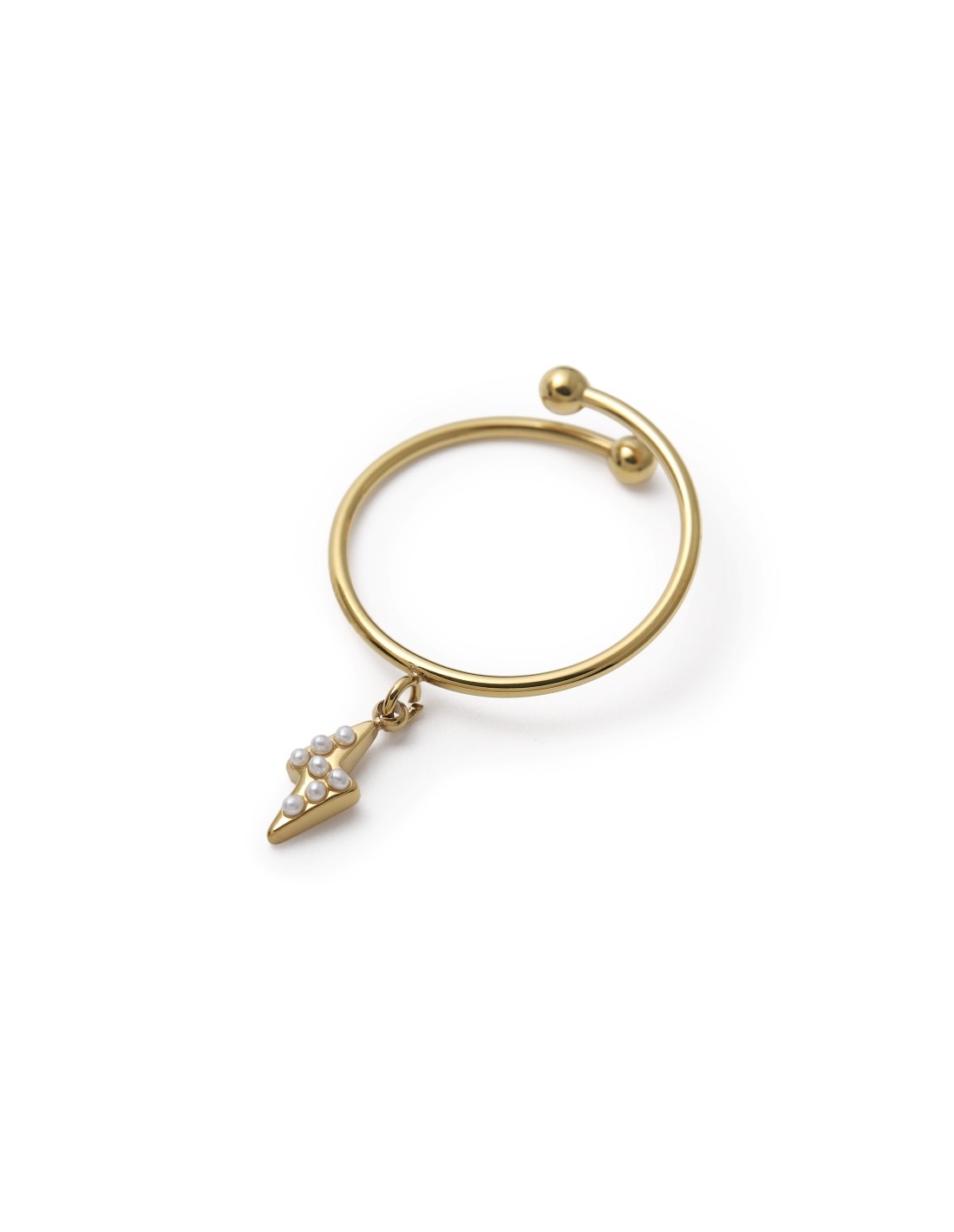 Anillo abierto con un colgante en forma de rayo, decorado con pequeñas perlas blancas. Una pieza moderna y llamativa que combina fuerza y delicadeza, perfecta para expresar estilo y personalidad.