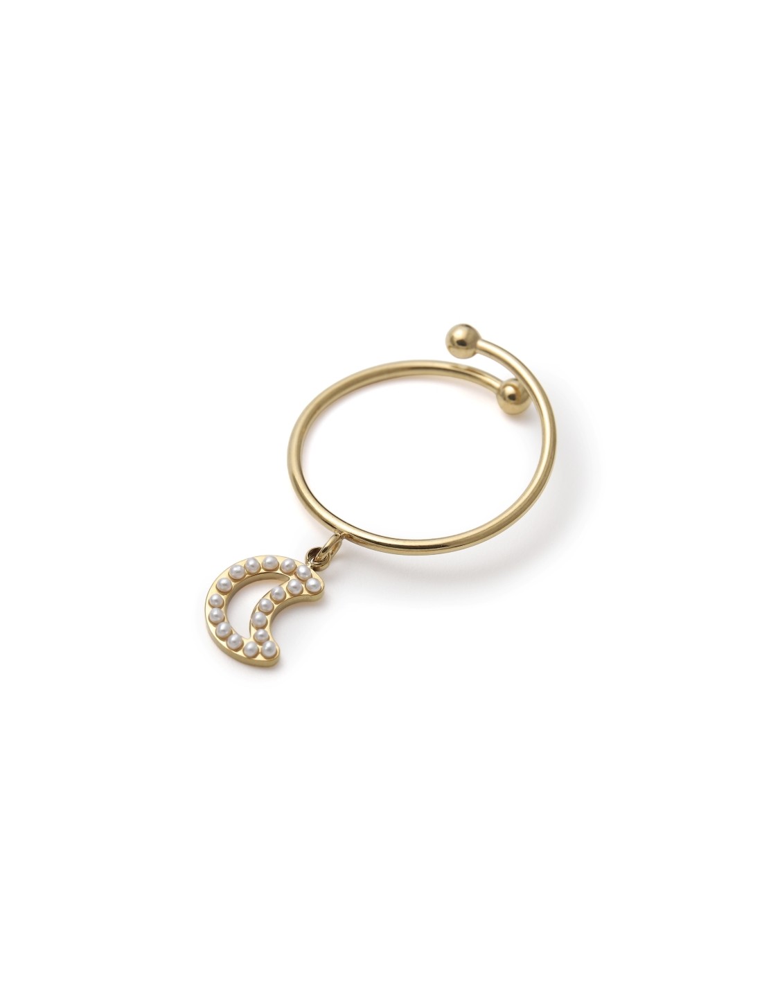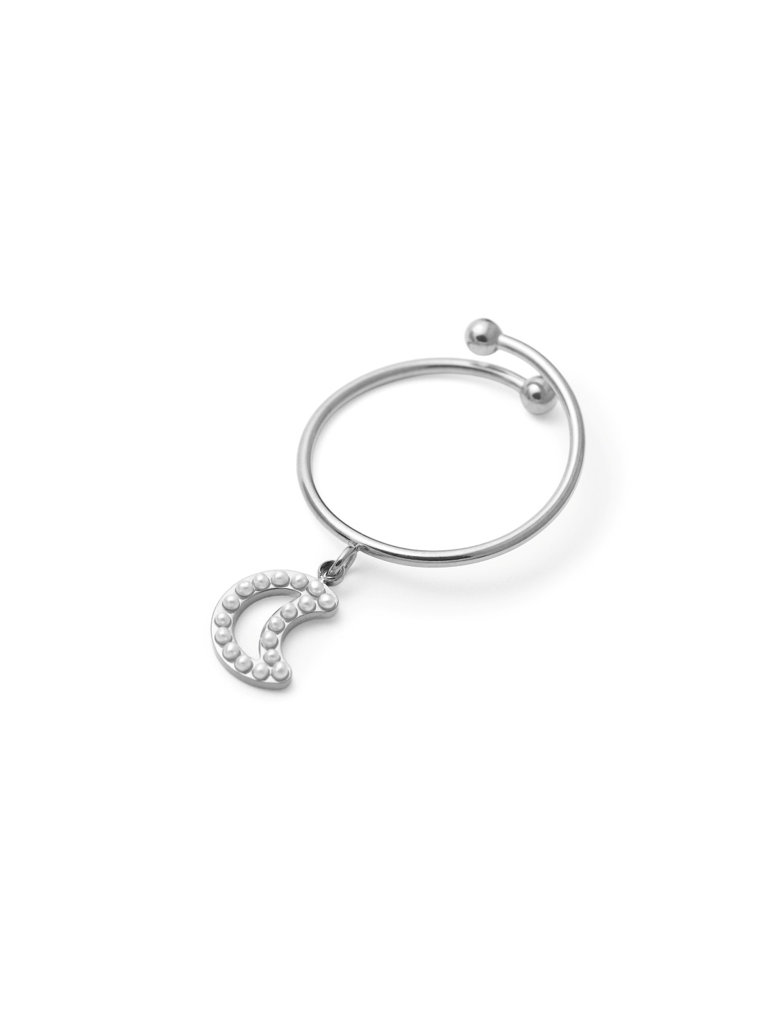 Anillo abierto acompañado de un colgante en forma de luna creciente decorado con delicadas perlas blancas. La luna simboliza misterio y feminidad, ideal para aportar un toque romántico y elegante a cualquier look.