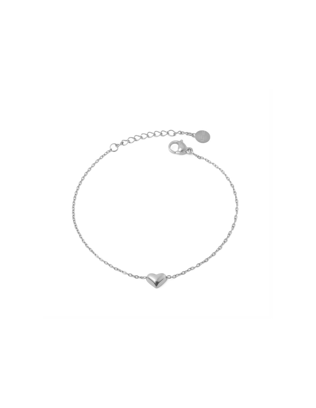 Pulsera elegante de color plateado con un pequeño corazón en el centro. Un accesorio sutil y romántico que complementa cualquier estilo con un toque de ternura.