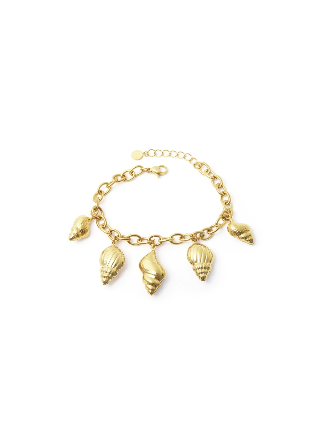 Pulsera con eslabones gruesos y colgantes en forma de conchas marinas. Un diseño inspirado en el mar que combina elegancia y estilo veraniego, ideal para destacar con encanto.
