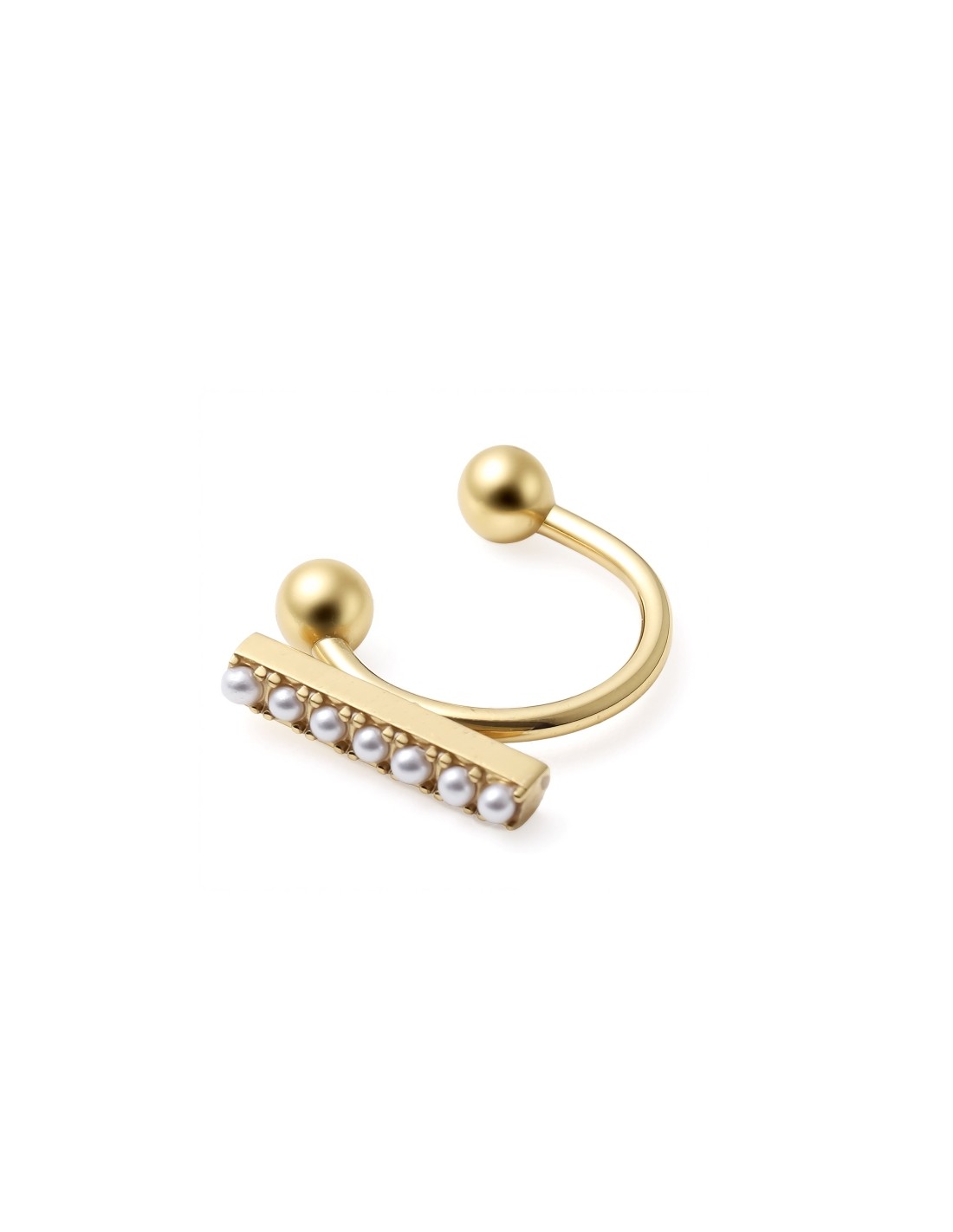 Clip de oreja con diseño abierto y una elegante barra decorada con pequeñas perlas. Una pieza moderna y refinada que combina sencillez y sofisticación.