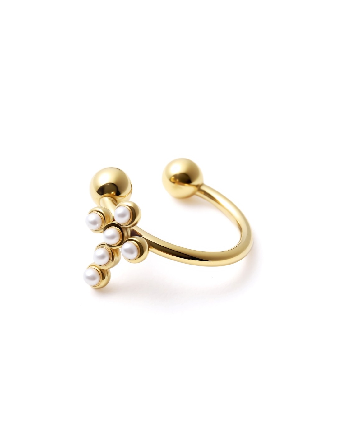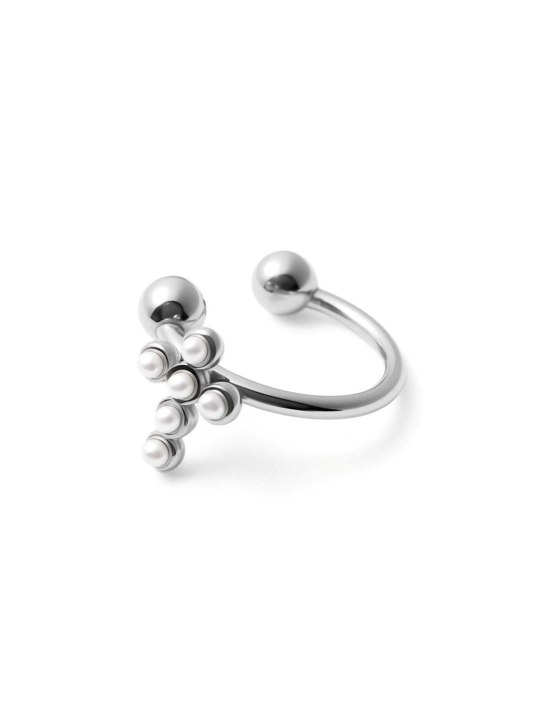 Clip de oreja con diseño abierto y detalle frontal en forma de cruz decorada con pequeñas perlas. Un accesorio elegante y distintivo que combina modernidad y delicadeza.