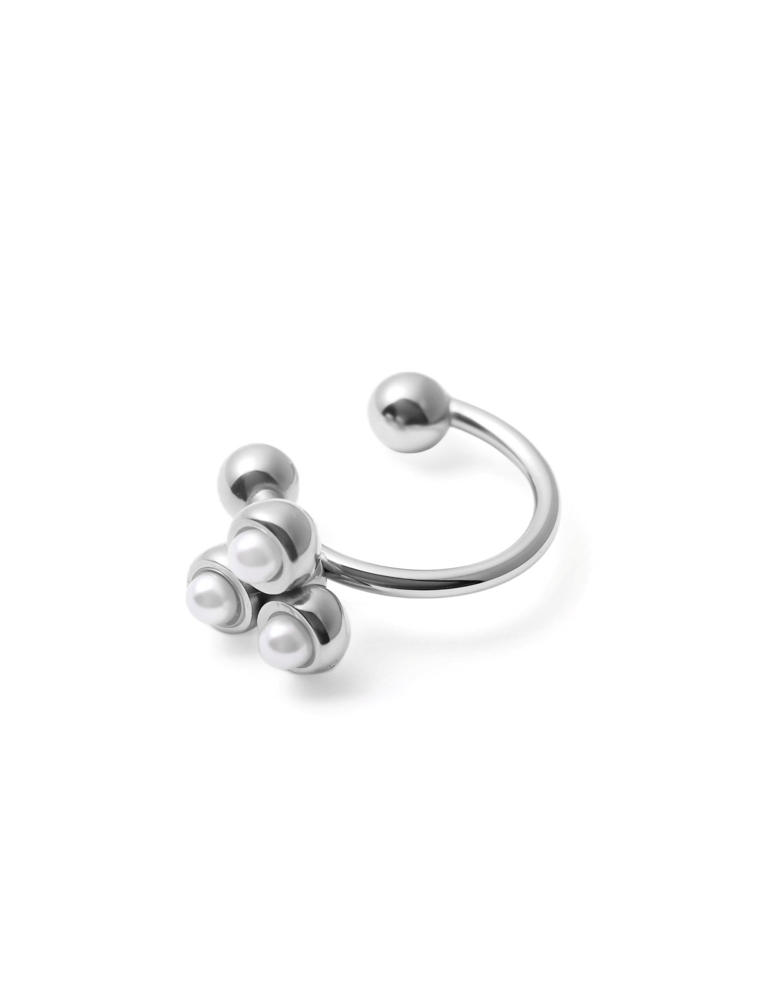Clip de oreja con diseño abierto adornado con tres pequeñas perlas. Un accesorio delicado y moderno que aporta un toque de elegancia sutil a cualquier estilo.