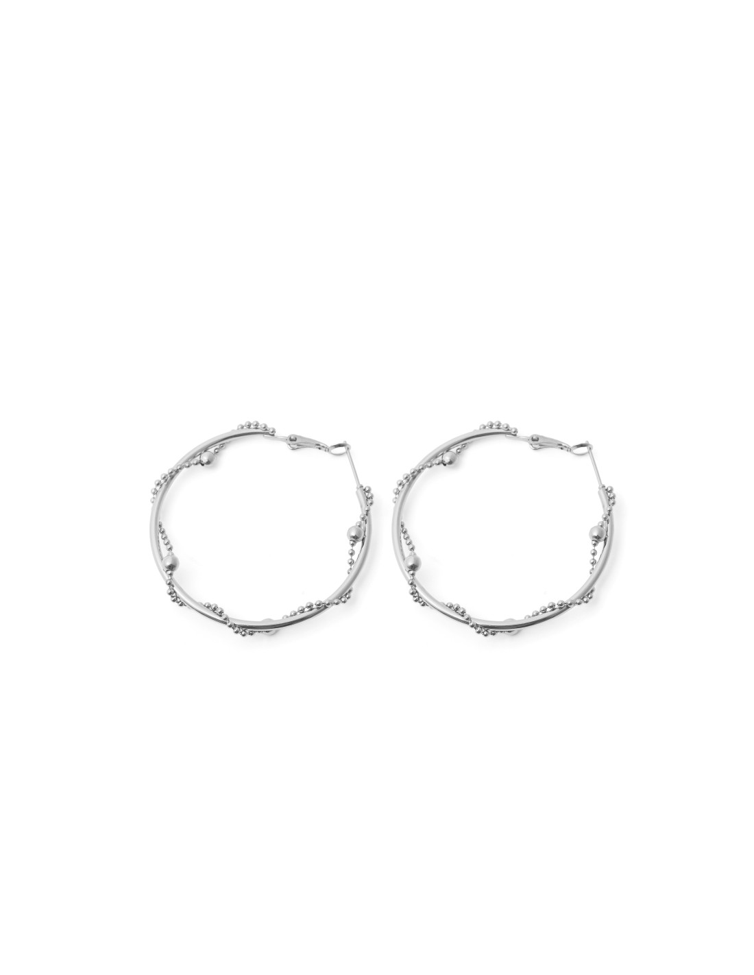 Pendientes de aro en color plateado decorados con pequeñas esferas a lo largo del diseño. Un accesorio moderno y elegante que aporta textura y brillo a cualquier look.