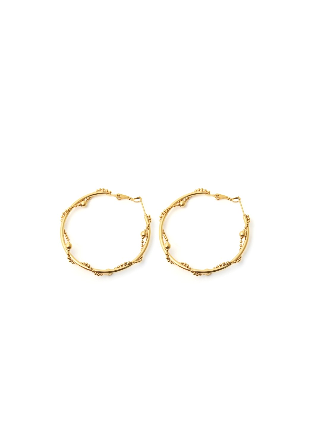 Pendientes de aro en color dorado decorados con pequeñas esferas a lo largo del diseño. Un accesorio moderno y elegante que aporta textura y brillo a cualquier look.