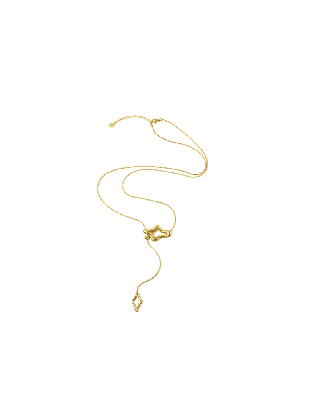 Collar largo en color dorado con colgantes de silueta geométrica y líneas onduladas. Su forma fluida y contemporánea aporta un toque artístico y moderno a cualquier conjunto.