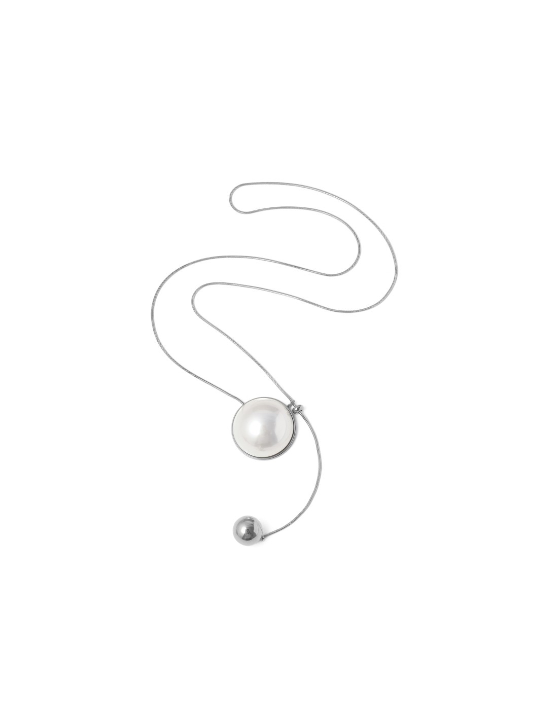 Collar largo plateado con un elegante colgante de gran perla redonda y detalle metálico en el extremo. Un diseño minimalista y sofisticado que resalta por su equilibrio y elegancia contemporánea.