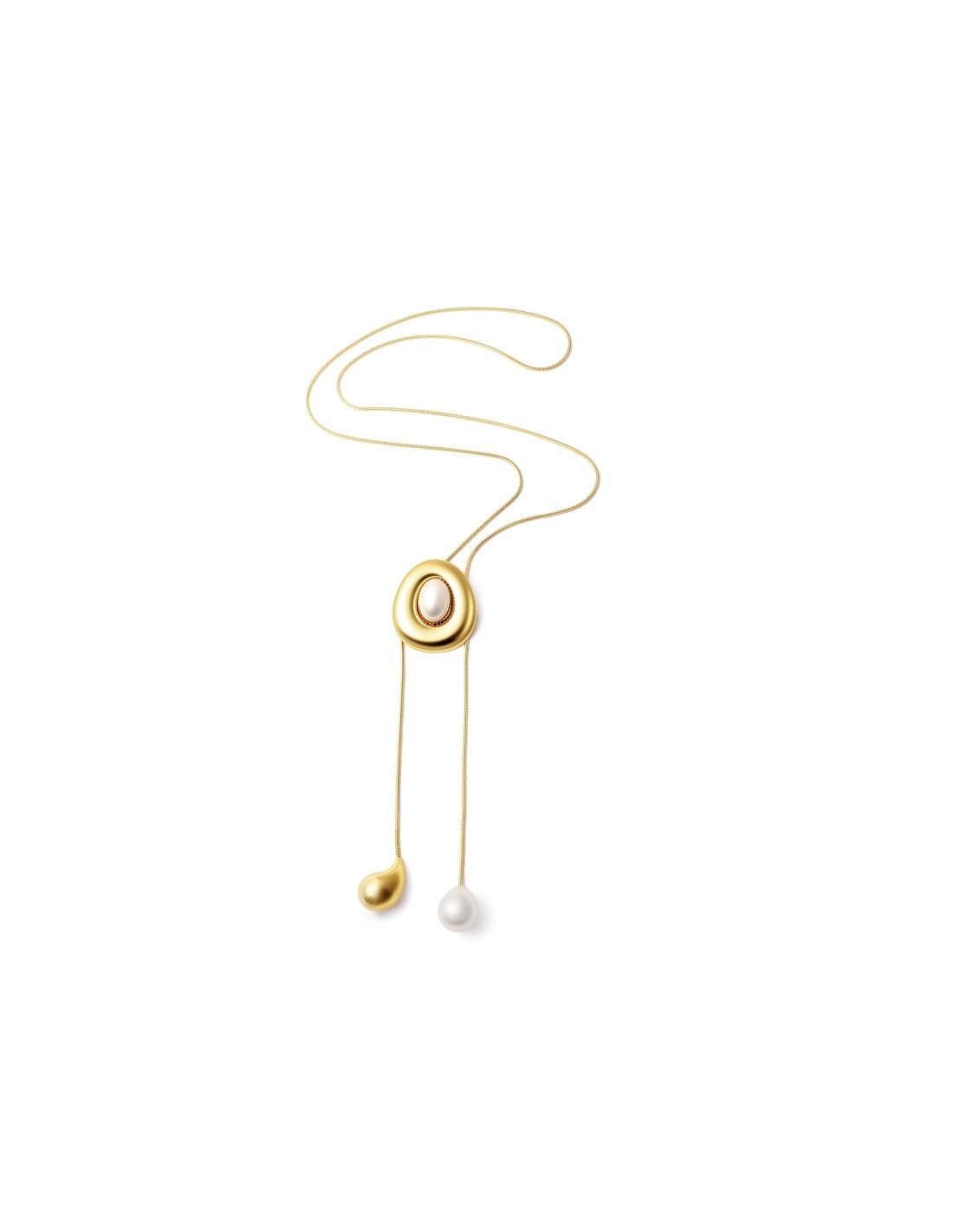 Collar largo dorado con colgante central ovalado que enmarca una perla blanca, acompañado de dos extremos rematados en perlas y gotas metálicas. Un diseño elegante y equilibrado, ideal para realzar cualquier look contemporáneo.
