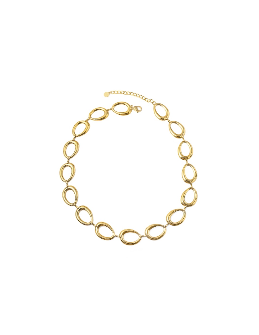 Collar corto dorado formado por una serie de eslabones ovalados irregulares de acabado pulido. Un diseño moderno y versátil que combina sofisticación con un estilo artístico y minimalista.
