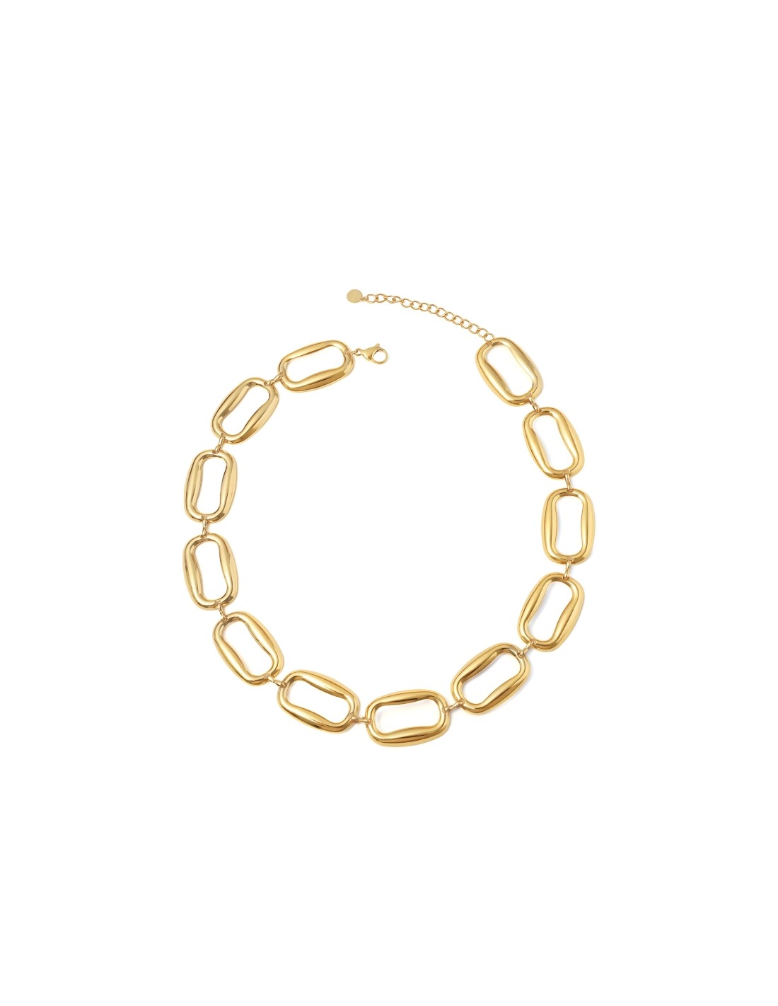 Collar corto dorado con eslabones rectangulares de bordes suaves e irregulares. Su acabado brillante y su diseño moderno lo convierten en una pieza versátil que combina elegancia con un estilo contemporáneo.
