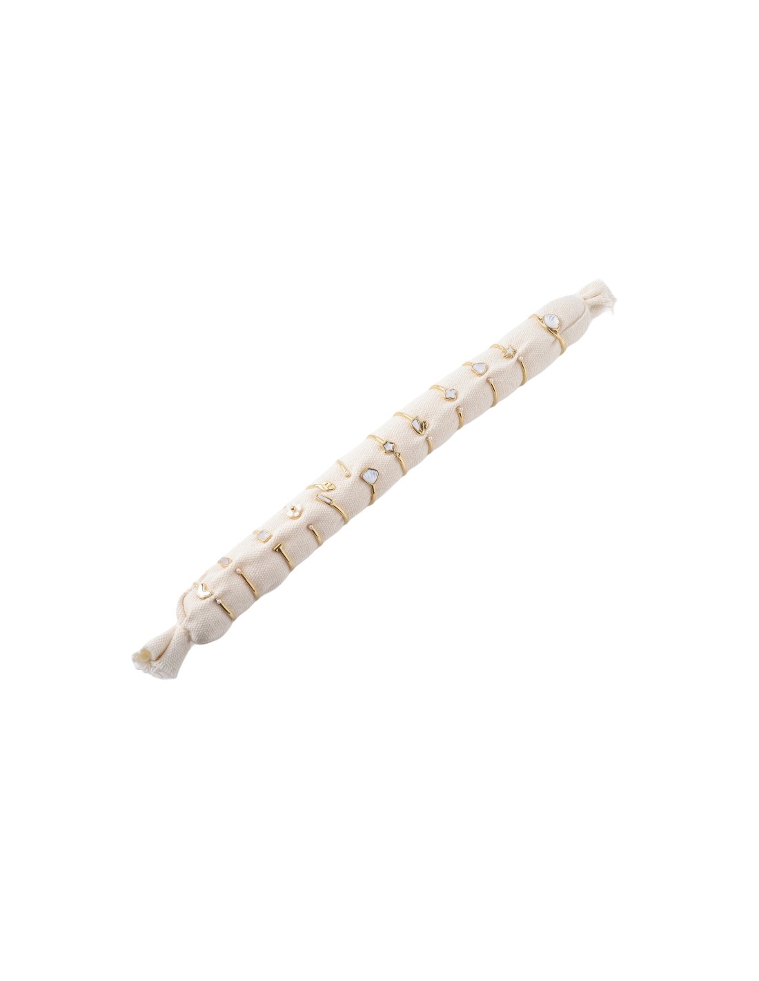Conjunto de 12 anillos dorados, decorados con delicados detalles de nácar y pequeñas figuras como corazones, estrellas, hojas y formas geométricas. Su diseño minimalista y elegante permite combinarlos entre sí o llevarlos por separado, creando un estilo versátil y moderno.