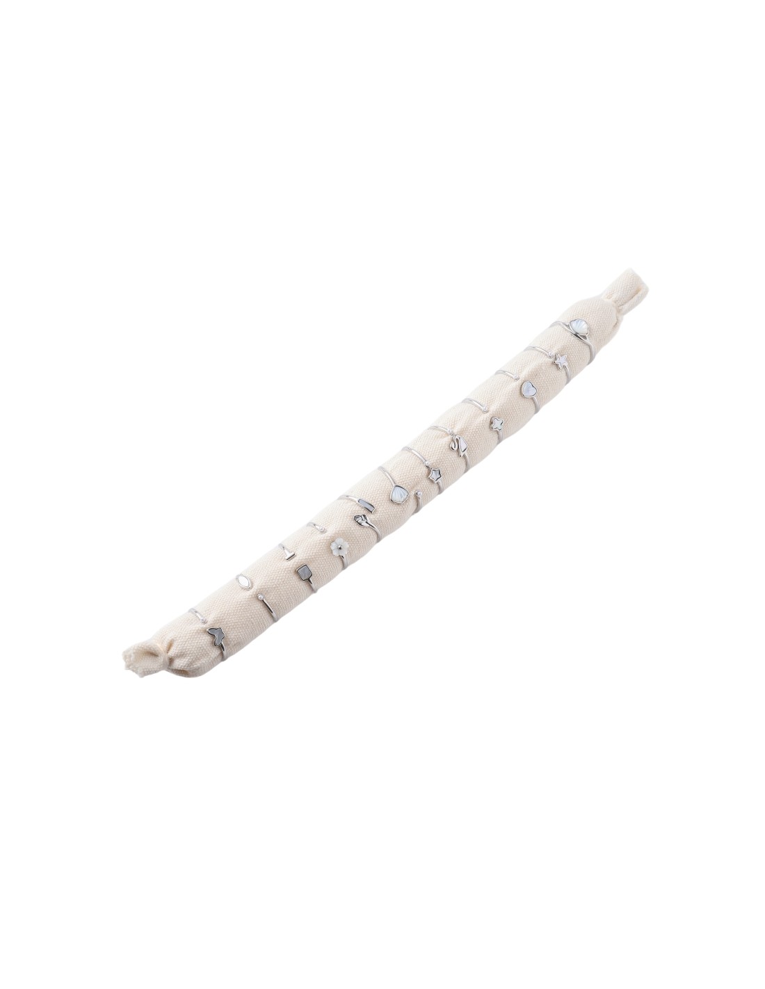 Conjunto de 12 anillos plateados, decorados con delicados detalles de nácar y pequeñas figuras como corazones, estrellas, hojas y formas geométricas. Su diseño minimalista y elegante permite combinarlos entre sí o llevarlos por separado, creando un estilo versátil y moderno.