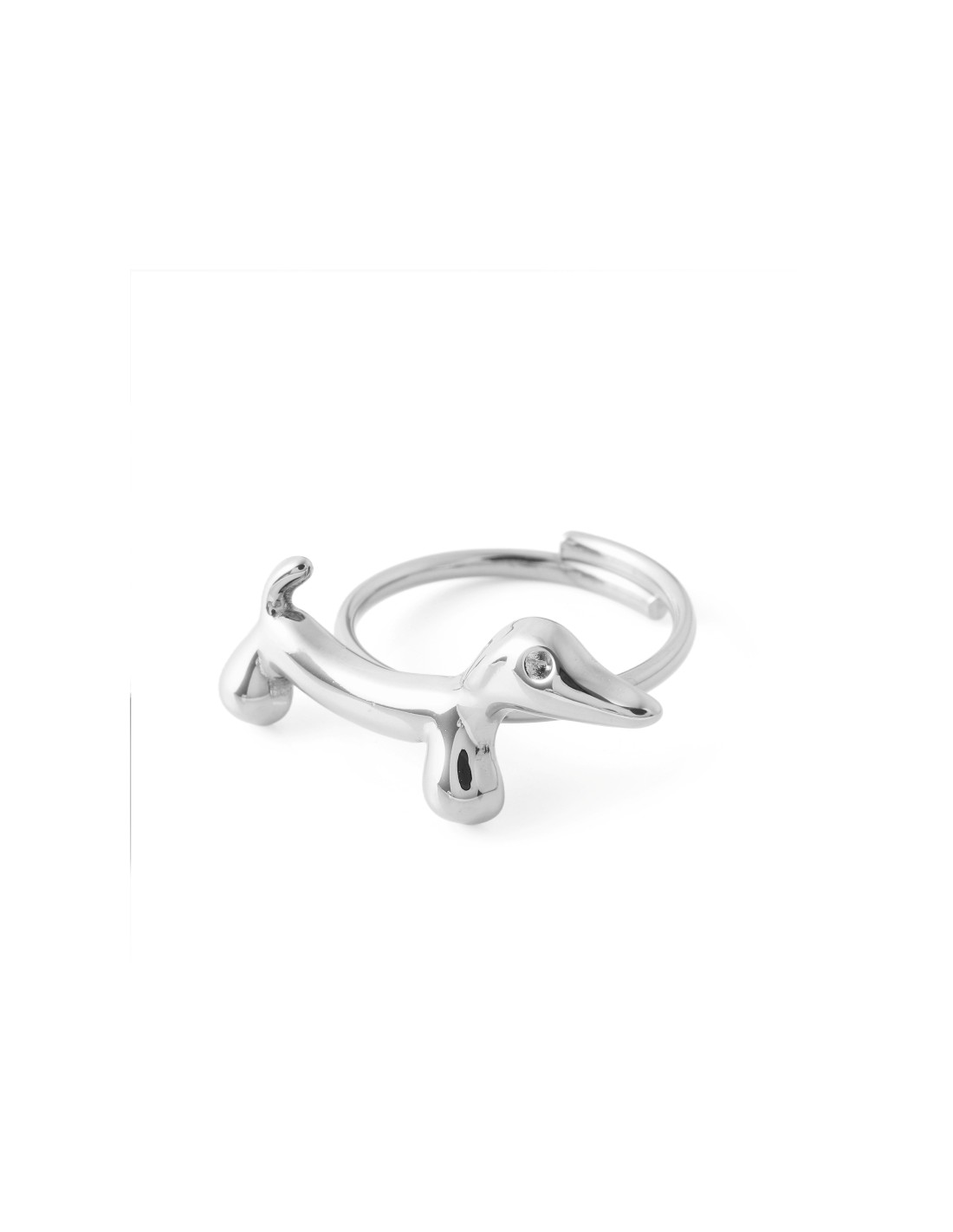 Anillo plateado con diseño de perro salchicha, brillante y ajustable, con un pequeño detalle de piedra en el ojo. Perfecto para quienes aman los animales y los accesorios divertidos.