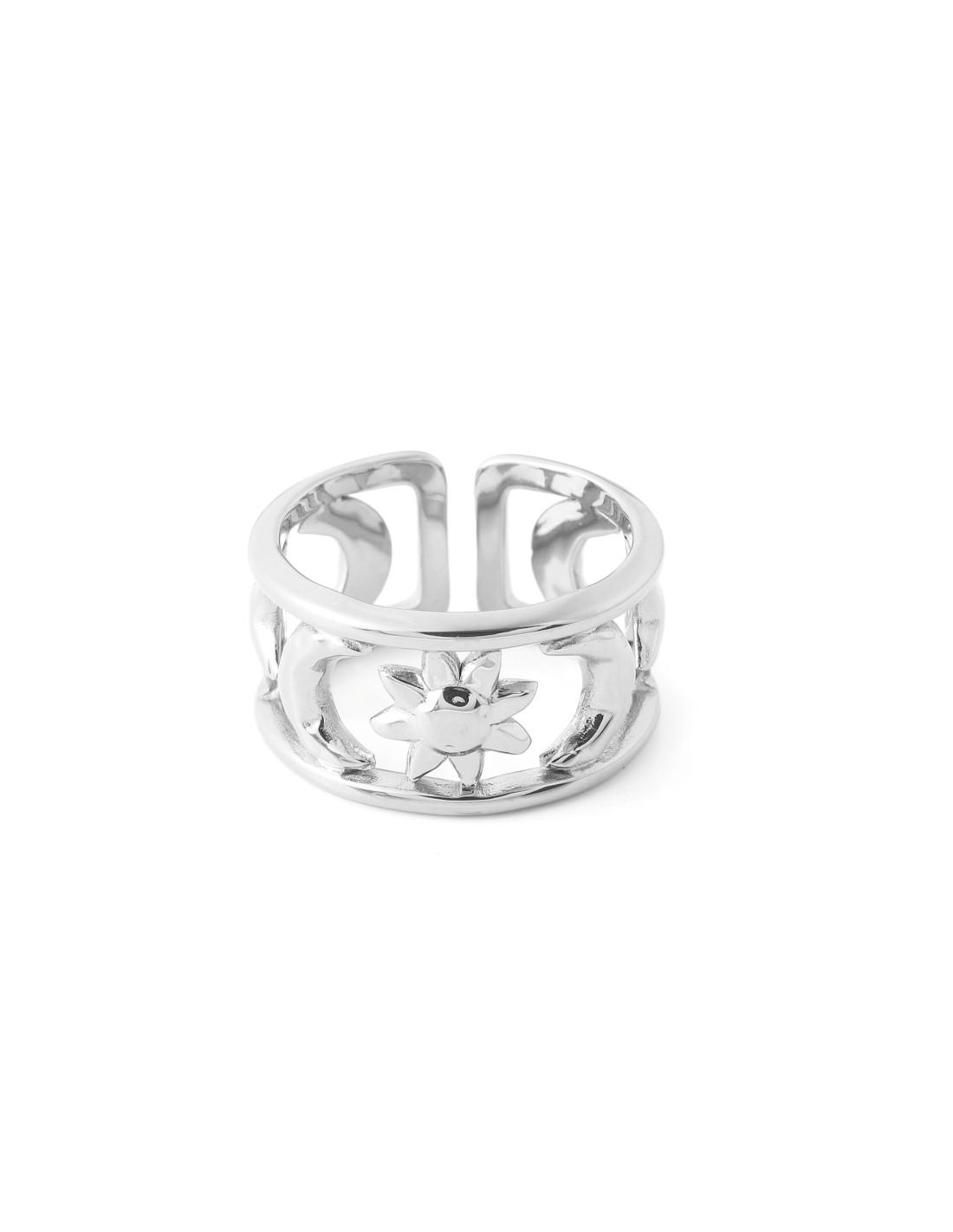 Anillo plateado ancho con diseño calado de estrella, luna y sol crecientes, ajustable y con acabado brillante. Un accesorio elegante que combina fuerza y feminidad.