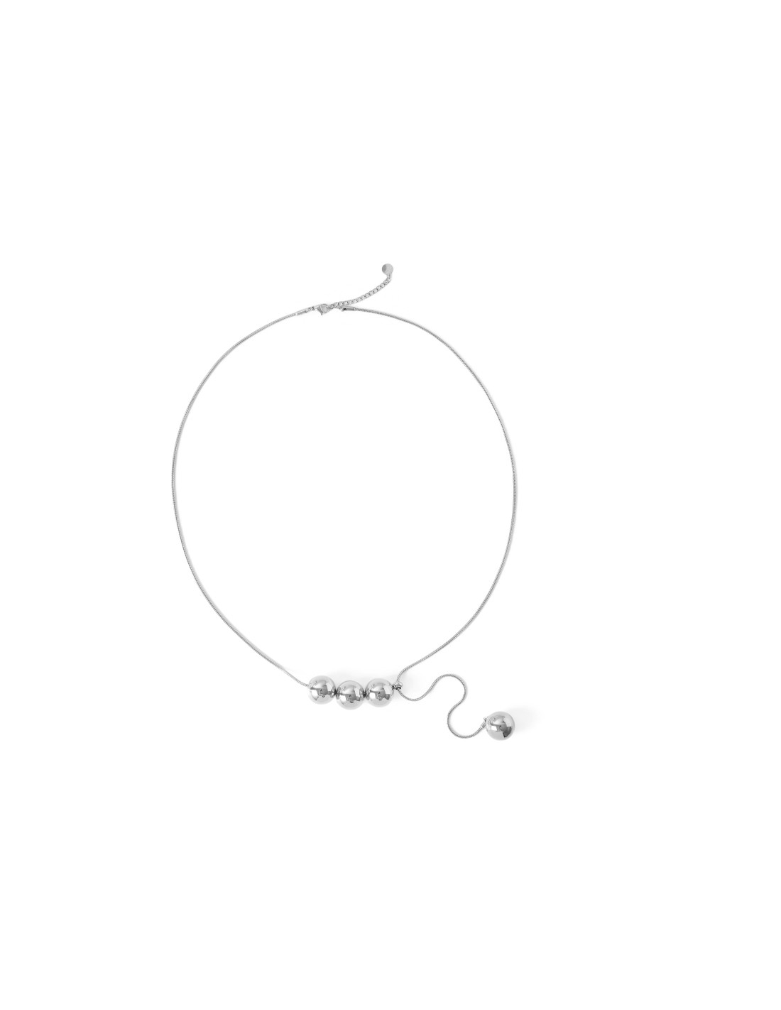 Collar largo plateado con varias bolas brillantes, de diseño moderno y elegante. Perfecto para combinar con diferentes estilos y aportar un toque sofisticado.