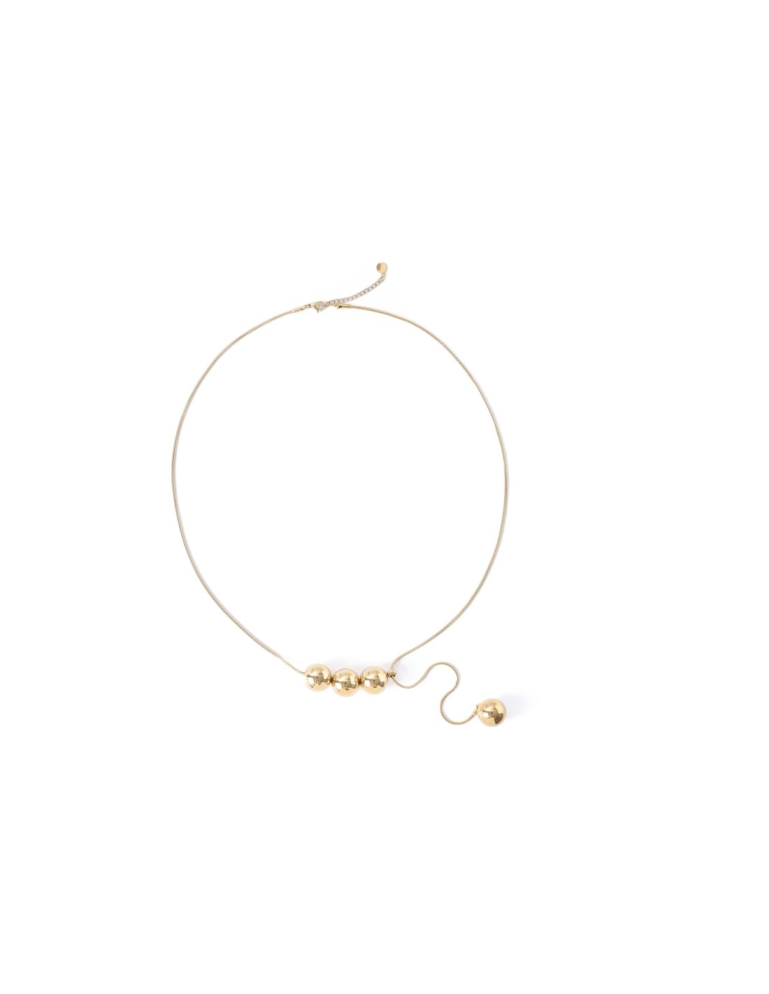 Collar largo dorado con varias bolas brillantes, de diseño moderno y elegante. Perfecto para combinar con diferentes estilos y aportar un toque sofisticado.