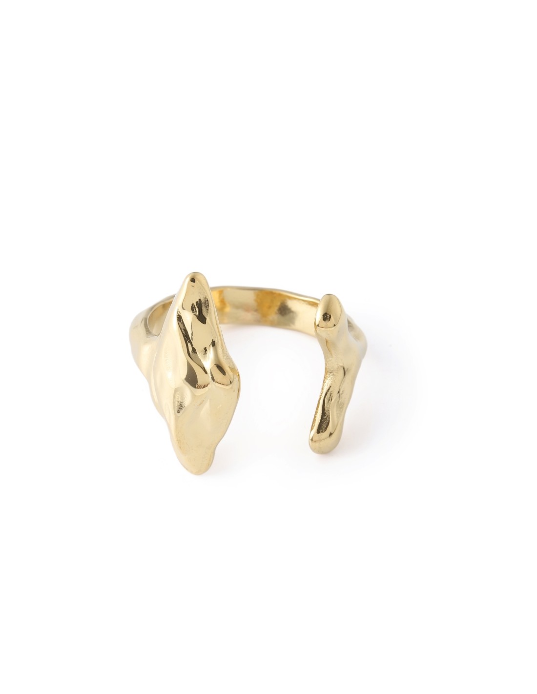 Anillo de diseño abierto con forma fluida y acabado brillante, inspirado en líneas naturales. Un accesorio moderno que destaca por su elegancia artística.