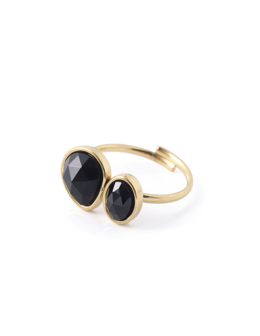 Anillo dorado con diseño abierto adornado con dos piedras tipo jade , de brillo suave y elegante. Una pieza delicada que transmite serenidad y encanto.