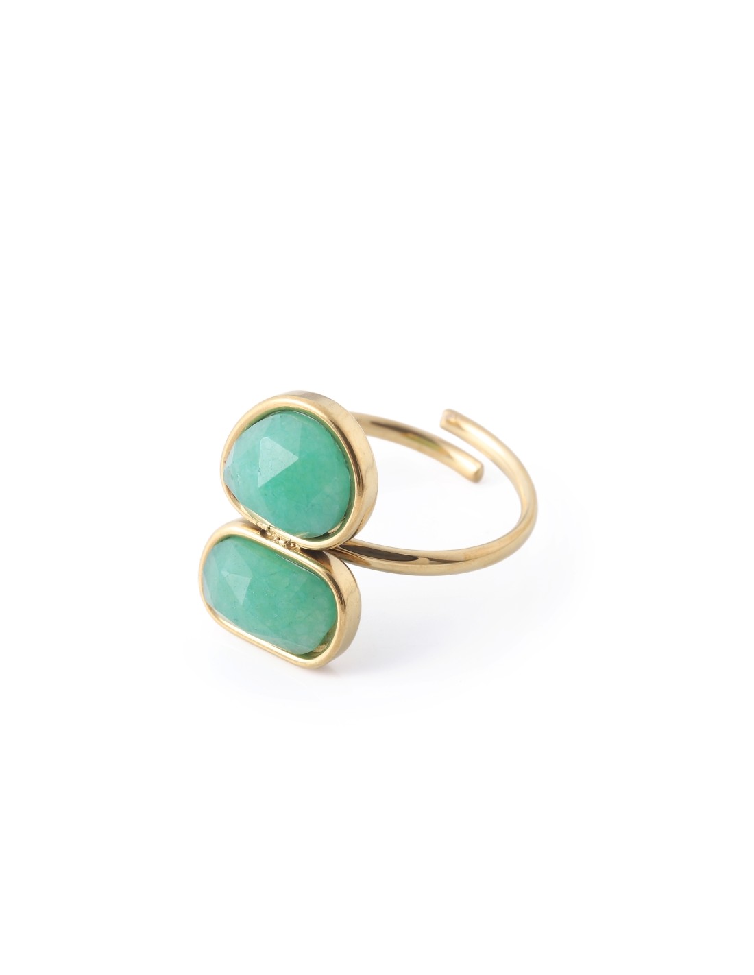 Anillo dorado con diseño abierto adornado con dos piedras tipo jade , de brillo suave y elegante. Una pieza delicada que transmite serenidad y encanto.