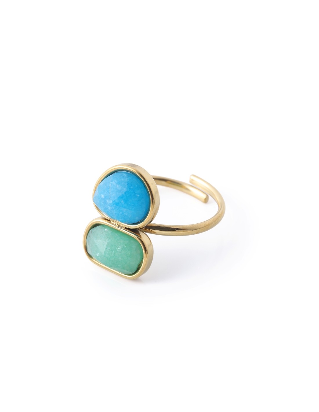Anillo dorado con diseño abierto adornado con dos piedras tipo jade , de brillo suave y elegante. Una pieza delicada que transmite serenidad y encanto.