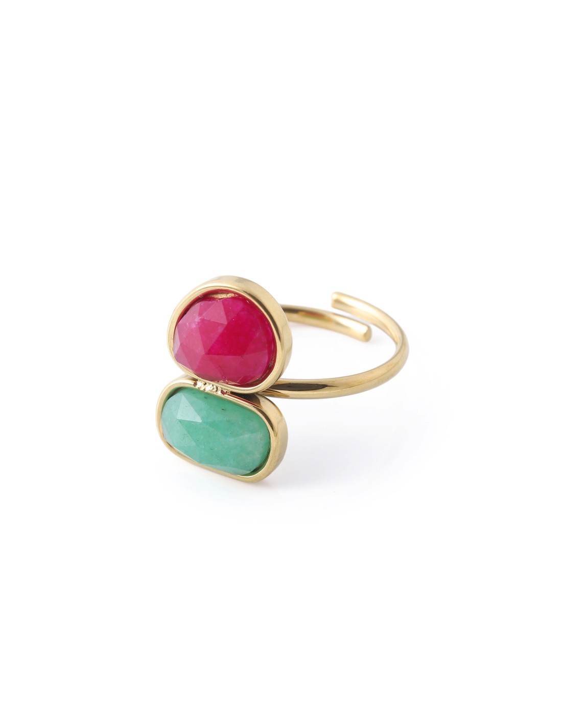 Anillo dorado con diseño abierto adornado con dos piedras tipo jade , de brillo suave y elegante. Una pieza delicada que transmite serenidad y encanto.