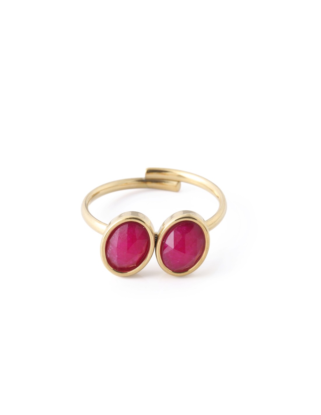 Anillo dorado con diseño abierto adornado con dos piedras tipo jade , de brillo suave y elegante. Una pieza delicada que transmite serenidad y encanto.