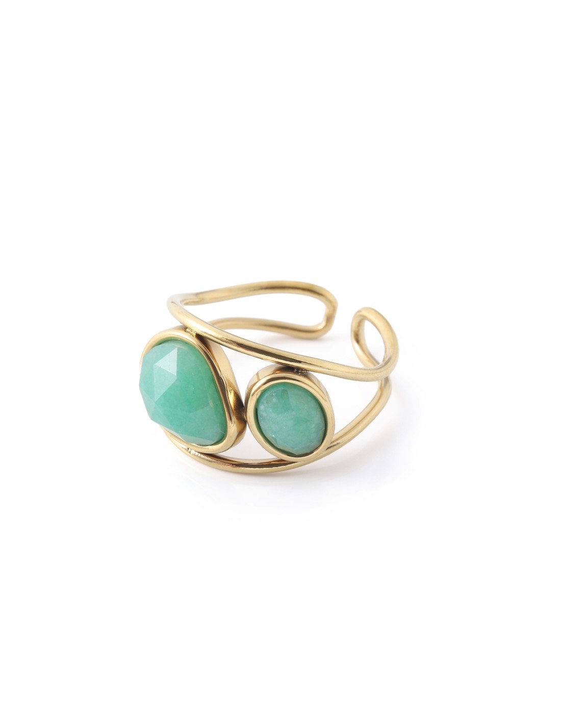 Anillo dorado con diseño de doble aro entrelazado, decorado con piedras de jade. Su forma envolvente y colores contrastantes reflejan equilibrio y elegancia natural.